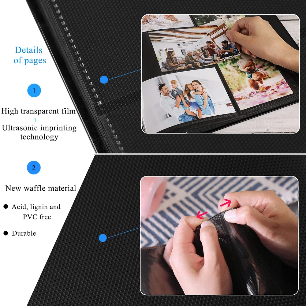 Ideal gift 1.A classic album is a great way to preserve and pass on these family photos. The PU leather photo album is a safe place to keep your photos, even for long term storage. Arrange baby pictures, vacation shots and more in this photo album. These are beautiful pictures and stories that you will be able to pass down generation after generation. 2.It is a durable and attractively designed black photo album that will easily complement any book or album collection and décor. Package Including: 1x Photo Album 9 Pieces Index tabs(1.77 inch) Specifications Capacity: Holds 700 4x6” photos (Each page has 5 pockets to holds 3 horizontal and 2 vertical photos) Cover: PU leather Album size: 13.2*12.3*2.36” (L x W x H) Window size: 3.94X3.94" Weight: 3.44lb Archival, Photo-safe: acid, lignin and PVC free. Advantages: 1.Photo album 4x6 700 photos have a screw binding, they have a classic look and resemble a traditionally bound book. It fits on a standard bookshelf and desk. 2.High-quality leather cover, waterproof, oil-proof, it can protect your photos much well. The PU leather of albums are more environmentally friendly, which is fully comply with international environmental standards 3.Photo pockets are made from clear plastic. It is easy and convenient. You just need to slide the picture into each pocket. 4.Taking ultrasonic imprinting technology, photos repeated insertion will not appear to be separated 5.The index tabs half of the file tabs with self-adhesive and half can be written, repositionable, convenient to stick and mark and remove cleanly. To fine the photos more easily. Note: Fit photo size 4" x 6"(10.2 x 15.2 cm), NOT FIT 4½" x 6"(11.4 x 15.2 cm). Let's take our journey and enjoy, if you have any questions, please us and let us know to make it right for you. 【PLENTY OF ROOM】The photo album measures 13.2*12.3*2.36inches (L x W x H). Weight: 3.44 lb. Album has a total of 70 sheet (140 pages) and holds 3 horizontal and 2 vertical photos per page. It stores up to 700 4x6 pictures. Fit photo size 4" x 6"(10.2 x 15.2 cm), NOT FIT 4½" x 6"(11.4 x 15.2 cm). 【EXQUISITE WORKMANSHIP】The high-quality PU leather hardcover will give you that elegant, classic, nice look. The screw binding made of stainless steel nails, which keeps the pages securely together and do not rust. Your photos will be better protected. This photo album lets you share and cherish your best moments for years to come. 【SAFE AND LONG-TERM PRESERVATION】Archival, Photo-safe: Acid, lignin and PVC free. So they will last for generations to come. The interior is designed with waffle material and high transparent film slots feel a bit delicate, for clear display, good durability and waterproof. High left (2.36”) and low right (1.37”) to make sure close properly after filling full the photos. 【PERFECT GIFT】There is a 3.94X3.94" photo window in front lets you insert a small photo as a cover for a more personalized look. And you can use the index tabs to organize, sort and arrange your photos according to date, themes, events or seasons. The index tabs stick securely but remove easily. Ideal gift for Valentine's Day, Christmas, Anniversary, Mother's Day, Thanksgiving Day, Birthday, Graduation, Wedding and so on. It could also be used as Travel Record, Wedding Album, Baby row Album. 【CUSTOMER SATISFACTION】This is 4x6 photos holds 700 photographs, it will be a perfect photo album for recording your wonderful moments. Please don’t worry, we have checked all the albums before send them out. If you have any questions please feel free to us, we're always here for you. Let's take our journey and enjoy.