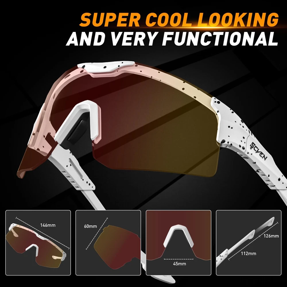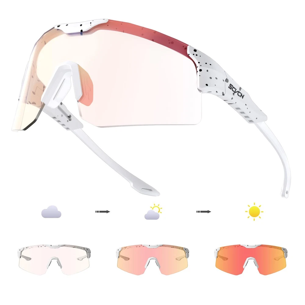 【Photochromic Glasses】The photochromic sunglasses darken and brighten according to the light conditions, they change from clear to red in sunlight, effectively protecting your eyes while providing a comfortable viewing experience. 【UV400 Protection】Thicken PC lenses with UV-Protective coating, shatterproof and scratch-resistant effectively, KAPVOE MTB glasses can defend against 99.9% of UVA/B/C rays and harmful blue light to 400nm, which can avoid aginst eye diseases and vision problems. 【Adjustable TR90 Frame】 Exquisite adjustable rubber legs, which can be pushed and pulled in 4 holes, makes SCVSN cycling sunglasses suitable for various face shapes, and the breathable nose pad can prevent misting, both make the mountain bike glasses more convenient to wear. 【Wrap around sunglasses】The wrap-around HD lenses design combines ergonomics to protect against wind and sand, allowing you to ride unhindered. With a performance features and a stylish look that fits your face like a custom pair of sunglasses. 【Lightweight Design】 With ultralight frame, forget you are wearing sports sunglasses in an adventure, don't let heavy sunglasses weigh you down, ideal for usage by cycling, driving, running, baseball, fishing, racing, golf, softball, climbing, trekking or other outdoor activities.