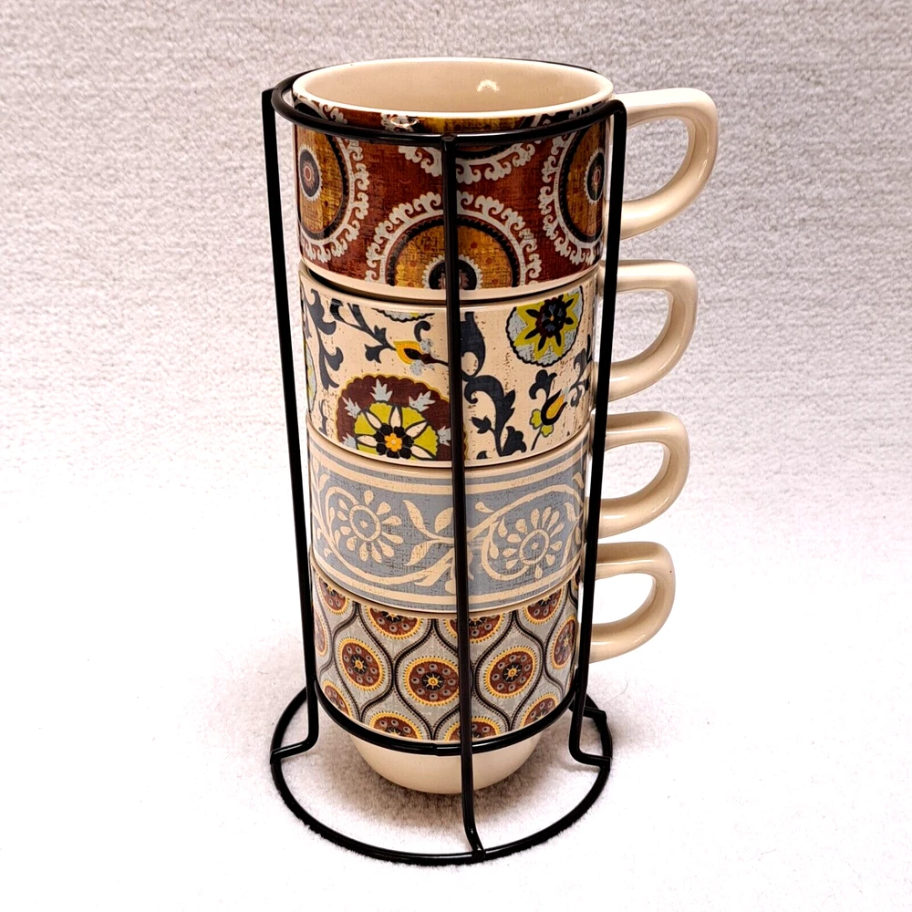 Add a touch of style to your coffee or tea time with this Pier 1 mug set. The set includes four ceramic mugs featuring a multicolor paisley pattern that adds a contemporary twist to your kitchen. The mugs are stackable, making storage simple. They also come with a round black vertical rack for easy storage. Each mug holds up to 8 fl oz and measures 3 inches deep. This coffee tea mug set is perfect for all occasions and can be personalized if desired.