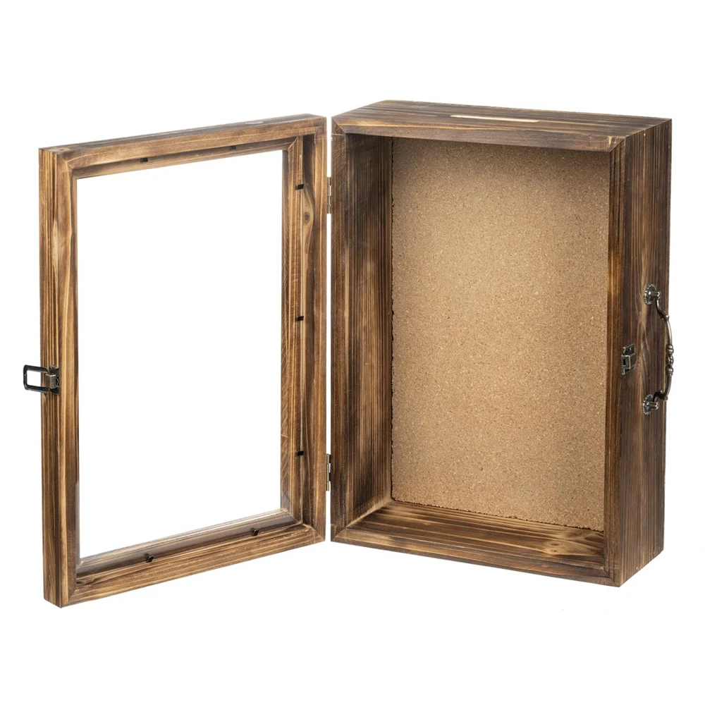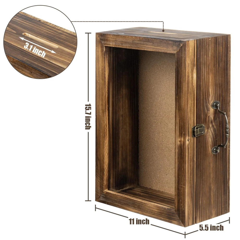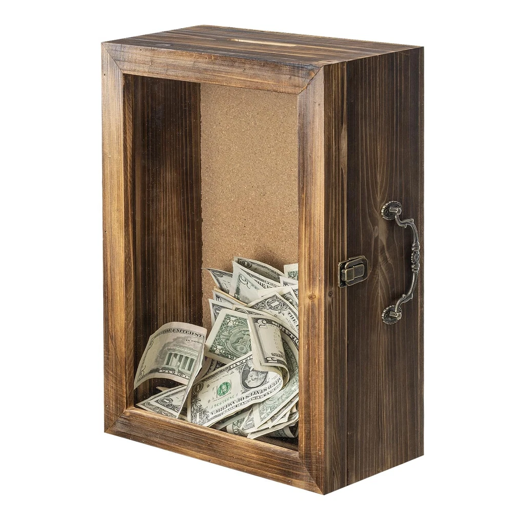 【Transparent View, Track Your Savings Easily】Featuring a transparent acrylic front, this piggy bank for adults allows you to clearly see the progress of your savings. Whether used as a family activity fund Coin Bank or an individual money bank for personal saving goals, every deposit brings a sense of accomplishment and motivation. Imagine the joy of opening it up to see a full handbag of money! 【Retro Pine Wood, Eco-Friendly & Elegant】Crafted from deep-roasted pine wood, this money bank boasts a strong retro brown aesthetic that not only serves its purpose well but also enhances your home decor. Pine wood is eco-friendly, allowing you to enjoy the joy of saving while contributing to environmental protection. 【Versatile Uses, Catering to Various Needs】More than just a piggy bank for saving coins, this wooden box can also be used as a shadow box or memory box to store cherished memorabilia and photos. The sealed acrylic front effectively keeps dust away, preserving your precious memories. The multifunctional nature of this money bank enriches your life in diverse ways. 【Unique Suitcase Design, Reflecting Your Personality】With an overall suitcase-inspired design, this piggy bank not only offers a unique visual impact but also showcases your individuality and taste, becoming a distinctive decoration in your home. The suitcase design also symbolizes the process of wealth accumulation, making the act of saving feel like collecting treasures, adding fun and meaning to your saving journey. 【SPECS】Overall 15.7 x 11 x 5.5 (in inches). Perfect for using on tabletop area or on the wall.