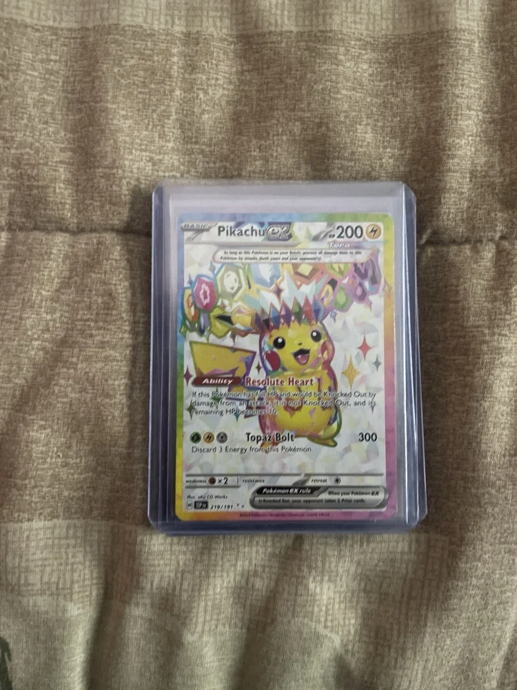 Ships out same day or next with care The Pikachu ex card from the SV08: Surging Sparks set is a highly sought-after Ultra Rare card, numbered 219/191. This card features a holographic finish and showcases Pikachu in its Terastal form, highlighting its unique design. Card Details: • HP: 200 • Type: Lightning • Rarity: Ultra Rare Abilities and Attacks: • Ability: Resolute Heart If this Pokémon has full HP and would be Knocked Out by damage from an attack, it is not Knocked Out, and its remaining HP becomes 10. • Attack: Topaz Bolt • Damage: 300 • Effect: Discard 3 Energy from this Pokémon. This combination of a protective ability and a high-damage attack makes Pikachu ex a formidable card in gameplay. Market Value: As of January 2025, the Pikachu ex 219/191 card has been observed with the following market values: • Raw Card: Approximately $47.78, with prices ranging from $2.50 to $1,194.00, depending on condition and demand.  • Graded PSA 9: Recent sales have been reported between $40.00 and $75.00.  • Graded PSA 10: Recent sales have been reported between $149.50 and $190.19.  Please note that market values can fluctuate based on factors such as card condition, grading, and demand. This card is a valuable addition for both collectors and players, offering a blend of aesthetic appeal and strategic advantage.
