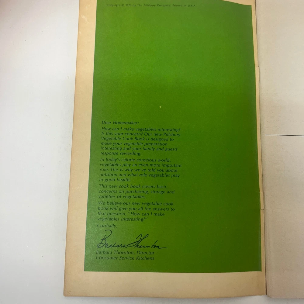 Pillsbury Vegetable Cookbook Paperback Book from The Pillsbury Company 1970 Dear Homemaker: How can I make vegetables interesting? Is this your concern? Our new Pillsbury Vegetable Cook Book is designed to make your vegetable preparation interesting and your family and guests' response rewarding. In today's calorie conscious world, vegetables play an even more important role. This is why we've told you about nutrition and what role vegetables play in good health. This new cook book covers basic concerns on purchasing, storage and varieties of vegetables. We believe our new vegetable cook book will give you all the answers to that question, "How can I make vegetables interesting?" Book is in good condition. General shelf and corner wear. Some white marks on the front and back cover. Some fraying along the cover edges. Staining on the front and back cover. A solid reading copy. Please see photos for details, and let me know if you have any questions. Shipping and Return Details The Use Coupon Code THEBOOKSAVINGS for a Buy 2 Get 2 FREE at checkout (must have 4 books in cart to apply). FREE Shipping if your order total is over $100. We can combine shipping. We ship daily so you can expect a quick delivery! We offer free returns. No questions asked. Please feel free to ask any questions you may have. Thank you from John & Cecelia a small town bookshop.