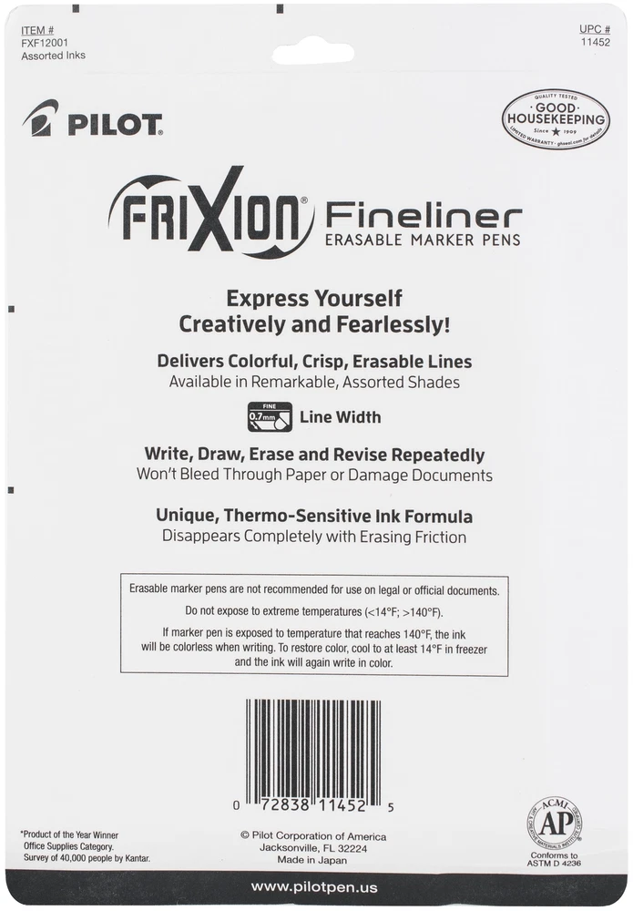 An erasable fine point marker pen, featuring a unique thermo-sensitive ink formula. No wear or tear so you can erase and rewrite until it's right without ruining the page. The FriXion Fineliner pen has a durable writing tip and delivers crisp, erasable lines ideal for grading papers and creating bullet journal spreads. Perrys Mart Our eBay Store About Us Contact Us Pilot FriXion Fineliner Fine Pt. Erasable Marker Pen 12/Pkg Assorted 25.17 An erasable fine point marker pen, featuring a unique thermo-sensitive ink formula. No wear or tear so you can erase and rewrite until it's right without ruining the page. The FriXion Fineliner pen has a durable writing tip and delivers crisp, erasable lines ideal for grading papers and creating bullet journal spreads. Product Details Color Assorted Height 1.200 Length 8.300 UPC 072838114525 Shipping Please refer to the delivery section located under shipping to see your estimated delivery schedule. Items may have an extended handling time. *Please note that international shipments take on average 6-30 business days to arrive. Ebay provides an estimated delivery time but some international transit times may be extended due to customs. Free shipping does not include custom fees, taxes and duties. Per eBay policies if a customer refuses a package because of customs fees, duties or taxes they void the right to a refund. If a refund is processed a restocking fee may be applied. It is the customers sole responsibility to pay these fees. FAQ'S This item is brand New Free shipping does not include custom fees, taxes and duties. Per eBay policies if a customer refuses a package because of customs fees, duties or taxes they void the right to a refund. If a refund is processed a restocking fee may be applied. It is the customers sole responsibility to pay these fees. Payment must be made through the secure eBay CHECKOUT system 30 Day Satisfaction Guarantee - All unopened items in which payment cleared within the last 30 days may be sent back to us for a full refund. Return shipping charges as well as original shipping and handling (S&H) charges will not be reimbursed. Refund will be issued by the original method of payment. No exchanges or store credits will be given. Refunds will only be issued for items returned © Copyright Perrysmart