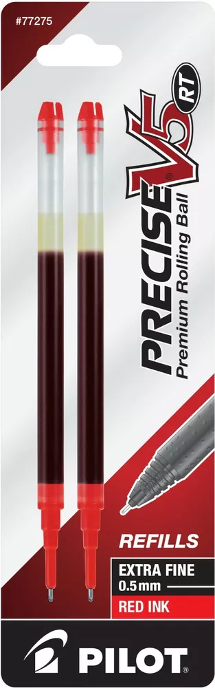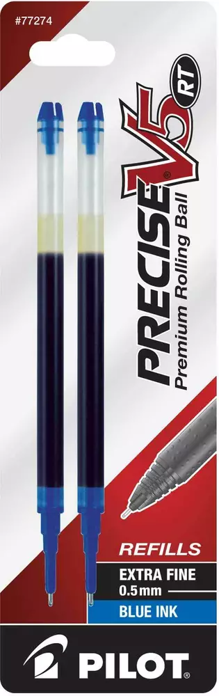 Pilot's high quality refills and accessories extend the life of Pilot products, creating ultimate value; an economic and environmentally-friendly option. Point Type: Extra Fine 0.5mm Smooth and skip-free writing Delivers precise and clean lines 3 colors available for extra fine point Each pack includes 2 refills. Sold as set of 3 Packs. Refill fits the following pens: Precise V5 RT retractable . About Precise V5/V7/V10 RT Pens There is a fine line between good and great and that line is drawn with Pilot Precise. Precise rolling ball retractable pens are designed to deliver the same kind of premium, precision writing experience as the capped version. Precise combines Pilot's exceptionally smooth writing ink, premium metal accents, and comfortable grip for a go anywhere sophisticated writing experience. Precise is ideal for those who prefer retractable pens and demand superior writing performance. Precision tip delivers a precise, clean line every time Retractable convenience with sophisticated metal clip Patented Precision Point Technology for smooth, skip-free writing Rubber grip with traction pockets Airplane safe system Refillable