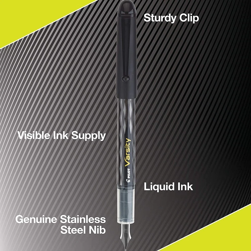 1 Deal Includes: 3 Pilot Varsity Black Fountain Pen and 3 Pilot Varsity Blue Fountain Pen Fashionable disposable fountain pen that's convenient and easy to use Now with a new modern design Advanced liquid ink system and unique real fountain pen nib guarantee smooth writing Visible ink supply allows you to see how much ink is left