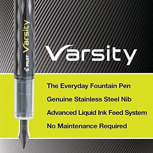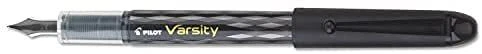 Enjoy an old school writing style with this fashionable disposable fountain pen. Each Pilot Varsity Disposable Fountain Pen features a retro style barrel with a real fountain pen nib. Other useful features include an advanced liquid ink system for smooth writing and a visible ink supply so you'll never be caught off guard by an empty pen. Pilot Varsity Disposable Fountain Pens - real fountain pens at an affordable price. Fashionable disposable fountain pen that's convenient and easy to use Now with a new modern design Advanced liquid ink system and unique real fountain pen nib guarantee smooth writing Visible ink supply allows you to see how much ink is left 6 Single pens with black ink