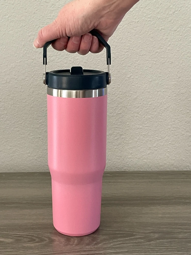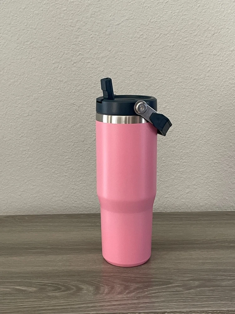 This listing is for a Pink 30 oz. Tumbler with Flip Straw perfect for both hot and cold beverages. It has a Drink Through lid type, and keeps drinks cold for up to 10 hours and hot for up to 8 hours. The tumbler is made of Steel and BPA-Free Plastic material, making it safe to use and machine washable for easy care. The tumbler is perfect for both adults and children, with a capacity of 890ml. It comes with a handle and a straw, making it convenient to use on the go. The tumbler is ideal for sports enthusiasts as it belongs to the Sports character family. Details: Color: Pink 18/8 stainless steel, BPA-free Double-wall vacuum insulation Leak-proof flip straw Easy-to-carry handle Car and bike cup-holder compatible Dishwasher safe