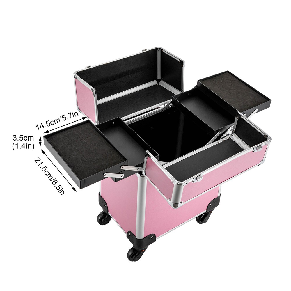 This pink rolling train case is a game-changer for makeup artists and beauty lovers! The sturdy aluminum alloy and ABS construction keeps everything secure, while the four spacious trays neatly organize all my cosmetics. The smooth universal wheels and retractable handle make it effortless to roll around, even fully loaded. The frosted finish gives it a sleek, professional look, and the latch opening ensures quick access. Perfect for travel or salon use—highly recommend for anyone who needs a durable, stylish, and ultra-functional cosmetic organizer!