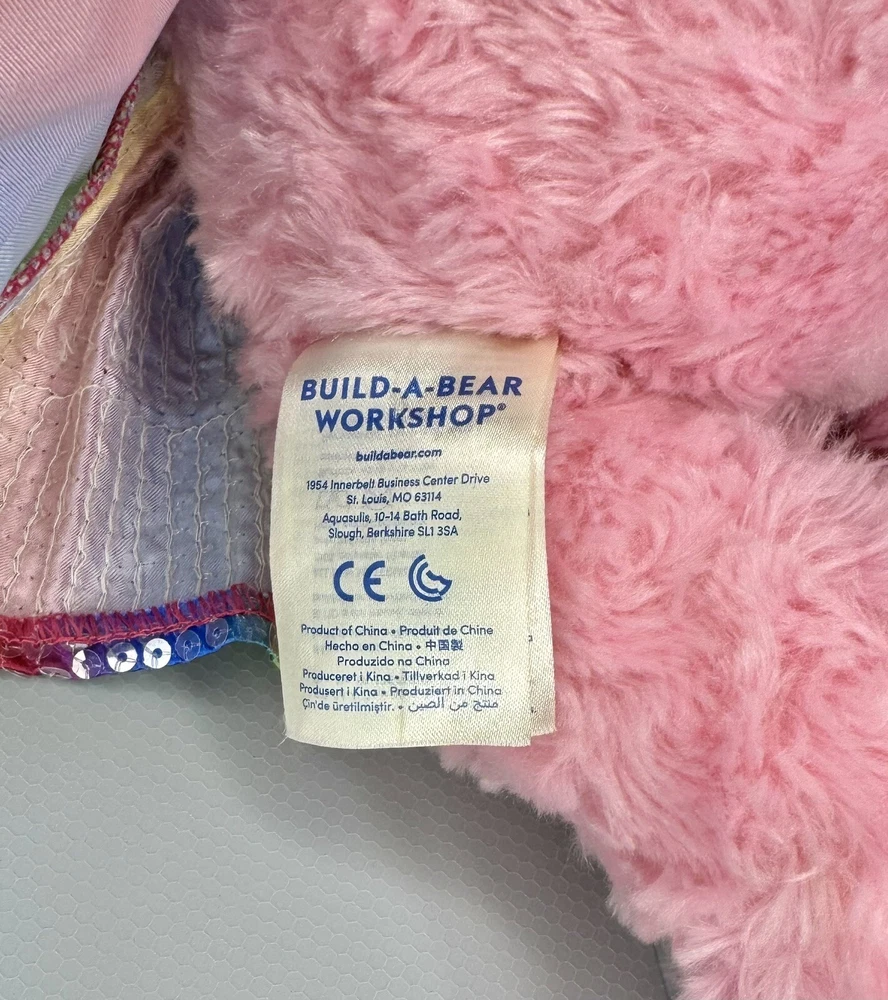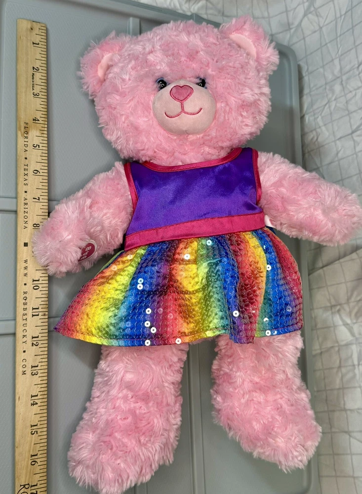 This adorable pink plush bear from Build-A-Bear Workshop is ready to make your heart skip a beat! With its charming blue eyes and colorful rainbow dress, this bear is sure to brighten up any room. Perfect for collectors or as a gift for someone special, this bear is made to be loved. Featuring a cute and cuddly design, this bear is sure to bring joy to anyone who receives it. The plush material and attention to detail make this bear a must-have for fans of the Build-A-Bear franchise. Don't miss out on the chance to add this lovely pink bear to your collection today!