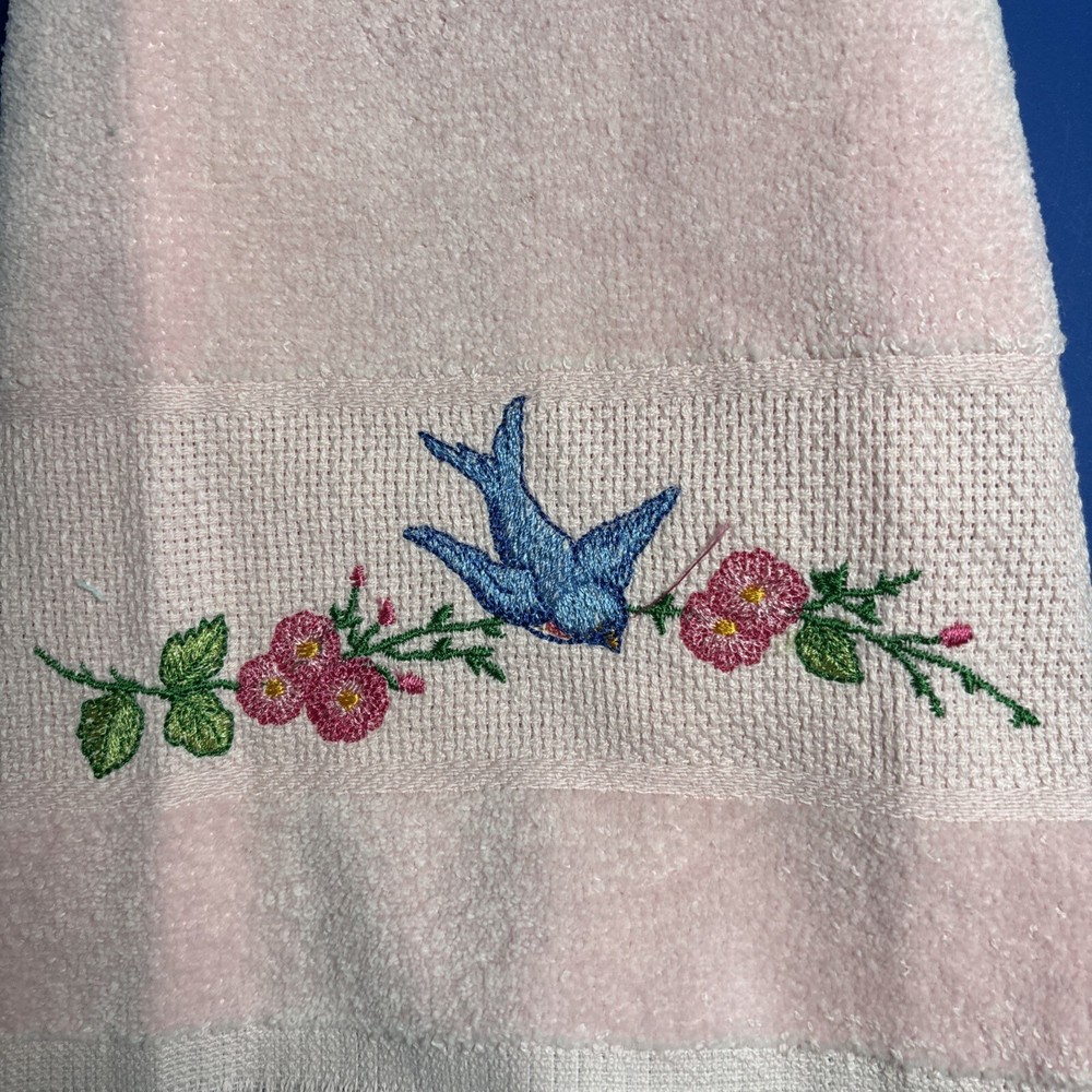 This hand-stitched guest towel features a charming bird pattern in a soft pink color, perfect for adding a touch of whimsy to your bathroom decor. Made from 100% cotton, this towel is not only soft and absorbent but also durable for repeated use. With dimensions of 11 inches wide and 18 inches long, this towel is ideal for drying hands and adding a decorative touch to your bathroom.