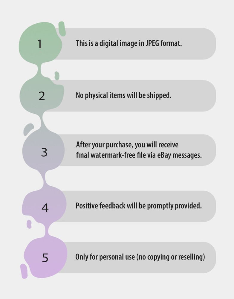 *POSITIVE FEEDBACK WILL BE PROVIDED AUTOMATICALLY WITHIN MINUTES OF THE PURCHASE* 1. WHAT YOU’LL GET Desktop wallpaper image: 4368 x 2448 px (16:9 ratio, png file) 2. HOW TO DOWNLOAD Following payment, you can download the files that will be delivered to your email box via eBay messages. 3. IMPORTANT NOTE This image may only be used for personal purposes; it may not be modified, reproduced, or resold in any way. You can definitely use this image for lots of creative, non-commercial projects. Here are some options beyond wall decoration: Scrapbooking: use the image as a fun embellishment for your scrapbook pages. Personal Stationery: print the image on your own stationery for a unique touch on your letters and notes. DIY Gifts: use the image to create personalized greeting cards for friends and family, like coasters, bookmarks, or even custom phone cases. Home Decor: use the image to create a custom pillowcase or other home decor items.