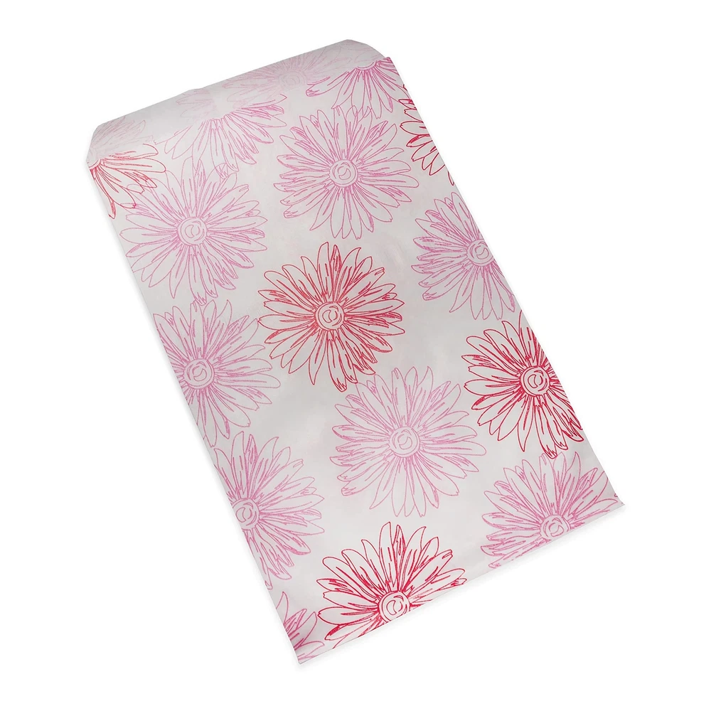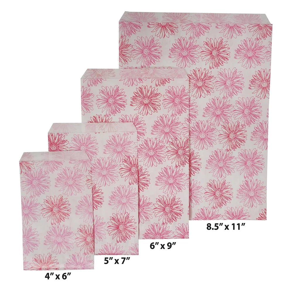 These Pink Flower patterned flat paper gift bags are a great choice for any retailer, party thrower or dedicated collector of flat paper gift bags. The eye-catching design is sure to draw attention from your family, customers, and friends. The 4 different sizes (4” x 6”, 5” x 7”, 6” x 9”, 8.5” x 11”) allow the bag to hold a wide variety of items, everything from jewelry boxes to baked goods to whatever party favors you have planned! We offer these bags in a variety of quantities to cater to your individual needs. Those who are having small events at their homes might prefer our 100 pack, while retailers who need them in bulk might gravitate towards our larger offerings. Each bag is coated with a semi-gloss finish for both aesthetics and to provide minor protection from tearing and piercing. These bags have no gusset which allows them to lie as flat as your choice of filling will allow, making them perfect for table settings or on top of display cases. The white bag base means these are perfect for any occasion, and the Pink Flowers work especially well in Spring and Summer! These Pink Flower bags are eye-catching and stylish, and are sure to hold the attention of your friends, family, and customers. Sold in packs of 100, 200, and 300. Whether you’re buying one pack for a party or buying in bulk for your own , you can find it here! Bags come in a variety of sizes: (4” x 6”), (5” x 7”), (6” x 9”), (8.5” x 11”). Find the right size for you! A perfect choice to package crafts, merchandise, or small gifts for parties, weddings or storefronts. Our flat paper bags are designed to be more tear resistant than typical paper bags as well as easy to open and fill.