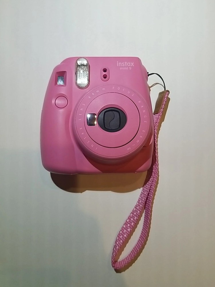 Pink Fujifilm Instax Mini 9 - Used & in good condition This set includes the camera, carrying case, and colored lenses. This is a used item but works great, especially for children who want simple photos. There is a slight stain on the top of the carrying case (see photo). Two AA batteries are needed but not included.