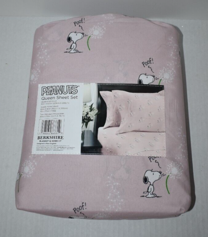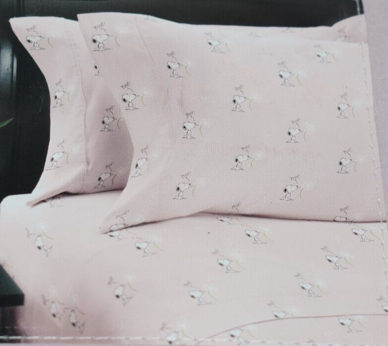 Peanuts Pink Snoopy Blowing on Dandelions Pattern Queen Size Sheet Set Pink sheets with a Snoopy blowing on dandelions pattern Includes: 1 Flat Sheet - 90" by 102" 1 Fitted Sheet - 60" by 80" 2 Pillow Cases - 20" by 30" Made of 100% Polyester New in package Customer satisfaction is my # 1 Priority!! Please contact me if you are not satisfied with any aspect of your purchase before leaving any feedback. S5