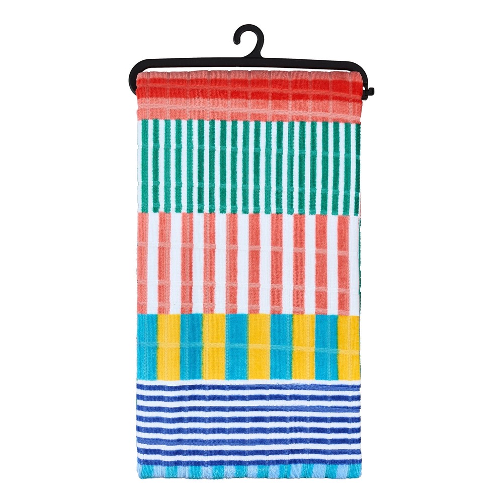 The luxuriously soft, highly absorbent, and vividly colorful Better Homes & Gardens Beach Collection Summer Pink Striped Cotton-Blend Beach Towel is a must-have accessory for an abundance of outdoor activities. This fun, oversized beach towel features a summery, multicolor pattern of horizontal and vertical stripes in shades of pink, blue, and green. Its generous 72" x 38" size and lightweight design make it versatile and practical. Use it for drying off, lying on, or sitting on at sporting events, festivals, or picnics. The attached hanging loop ensures easy drying and storage. Woven from 83% BCI cotton and 17% viscose, this durable towel includes reinforced side hems to prevent fraying and is machine washable. The Better Homes & Gardens Summer Pink Striped Beach Towel is ideal for days at the beach, lake, pool, park, and all your other favorite outdoor destinations. Colorful, oversized beach towel is luxuriously soft, highly absorbent must-have for outdoor activities Features a summery, multicolor pattern of horizontal and vertical stripes in shades of pink, blue, and green Attached hanging loop, extra-large size, and light weight make towel practical and versatile Ideal for beaches, lakes, pools, parks, picnics, sporting events, and festivals Reinforced side hems help prevent fraying Home decor style: Coastal Fabric content: 83% BCI cotton, 17% viscose Dimensions: 72"L x 38"W Weight: 420 GSM Package dimensions: 2"L x 10"W x 33"H, 1.62 lbs Care: Wash before use, machine wash cold with like colors, delicate cycle, deep colors may bleed, do not bleach, tumble dry low