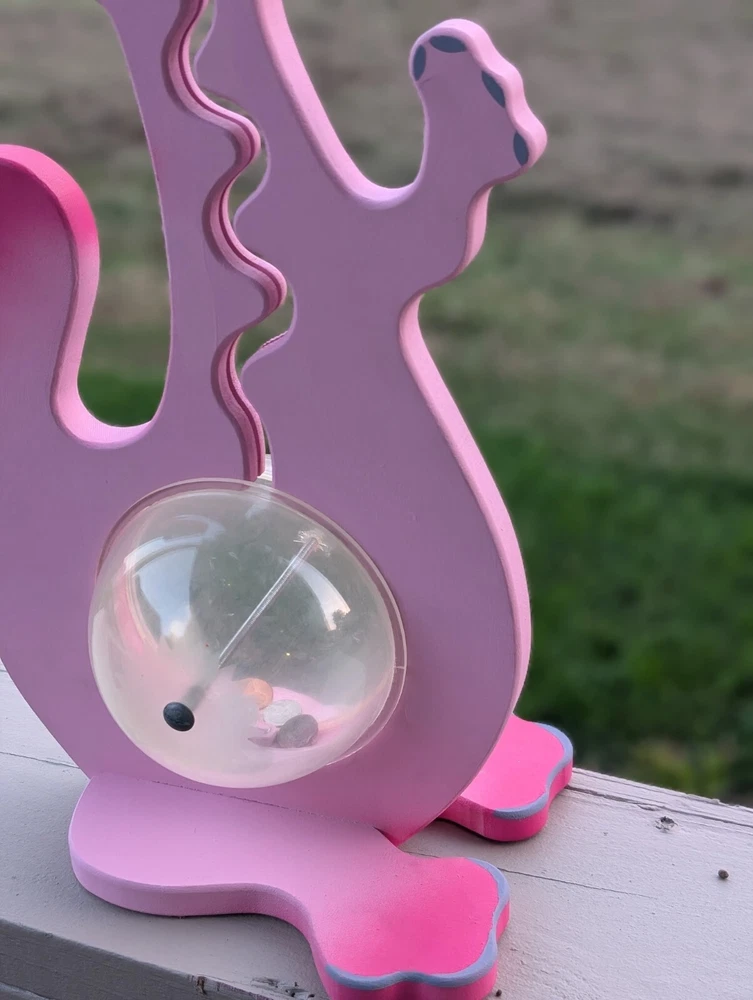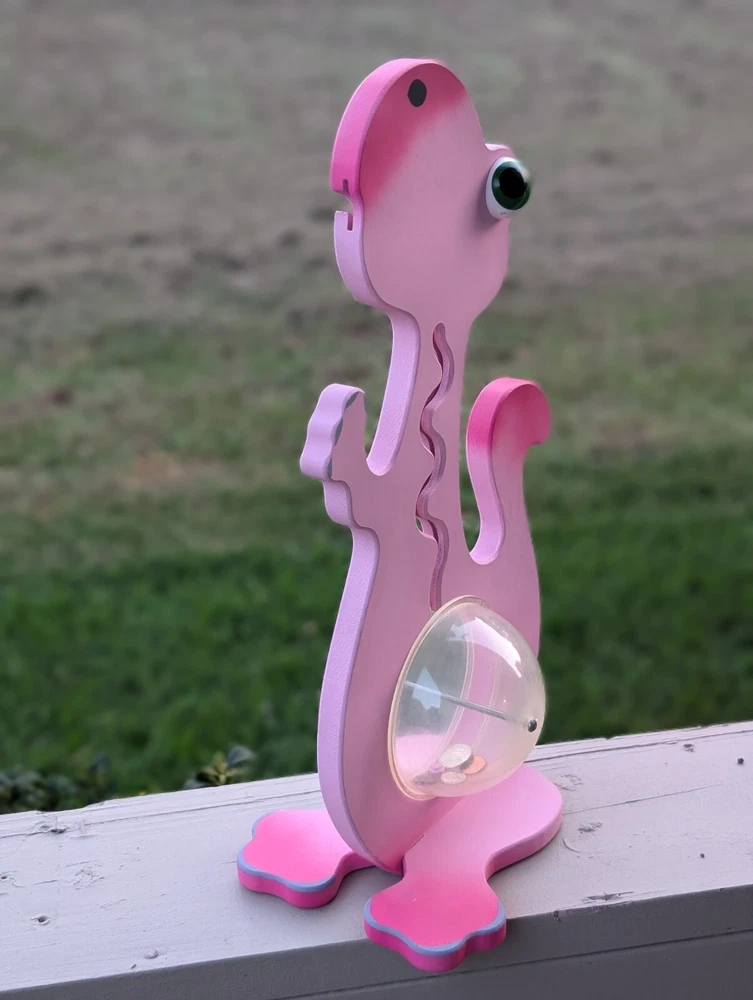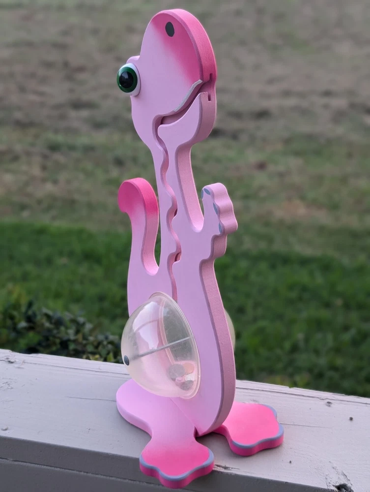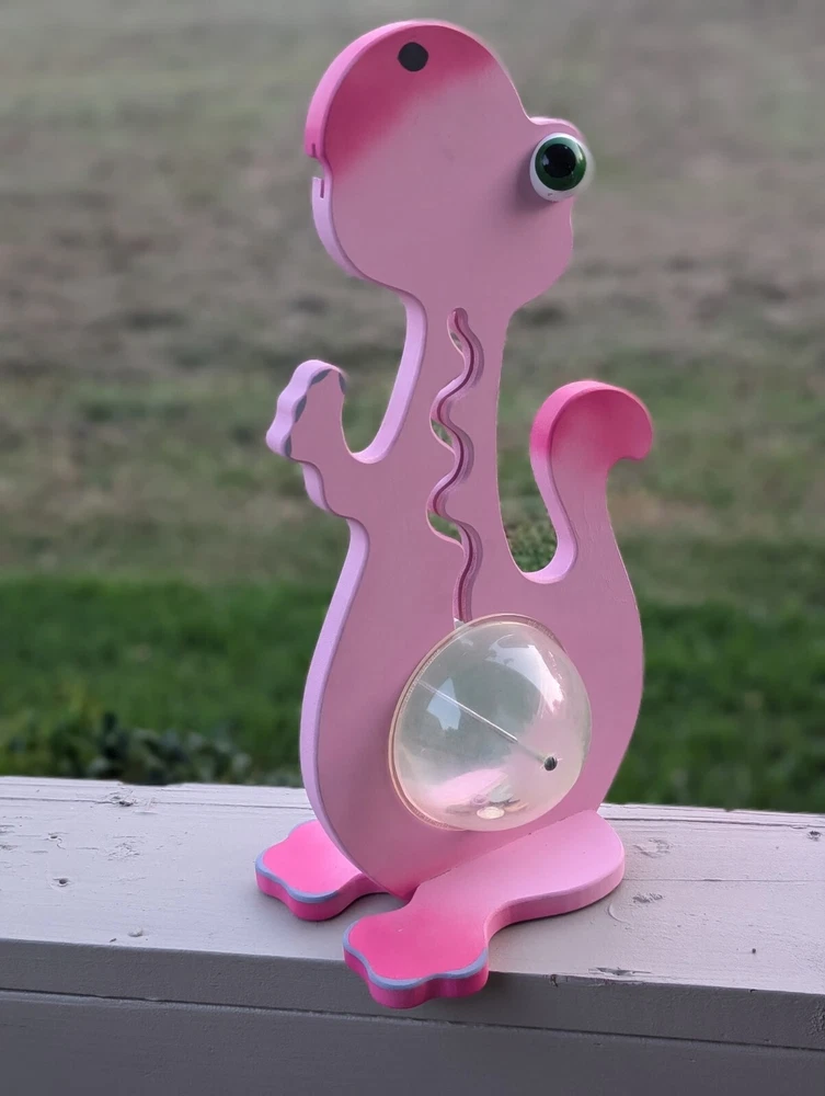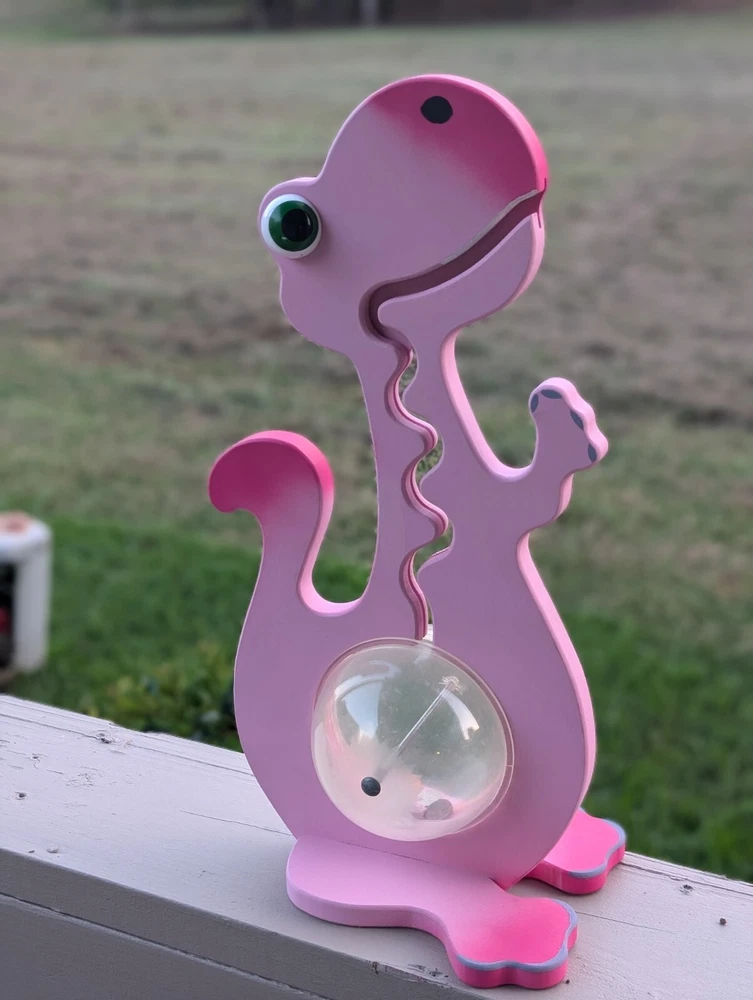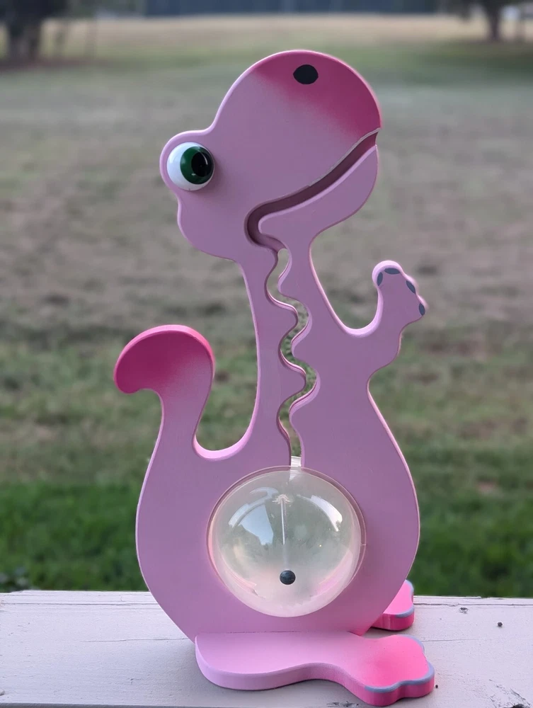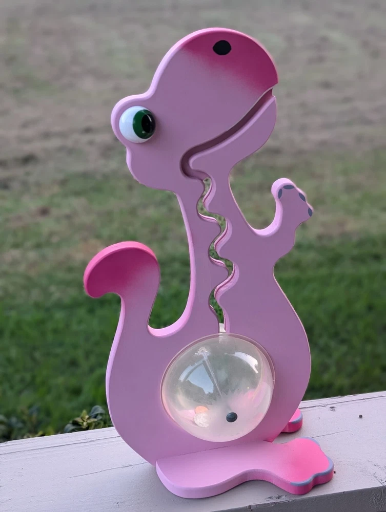 dinosaur-shaped bank. Stands on the floor. This is probably the coolest piggy bank! You put the coin in its mouth and watch It go down in her belly.