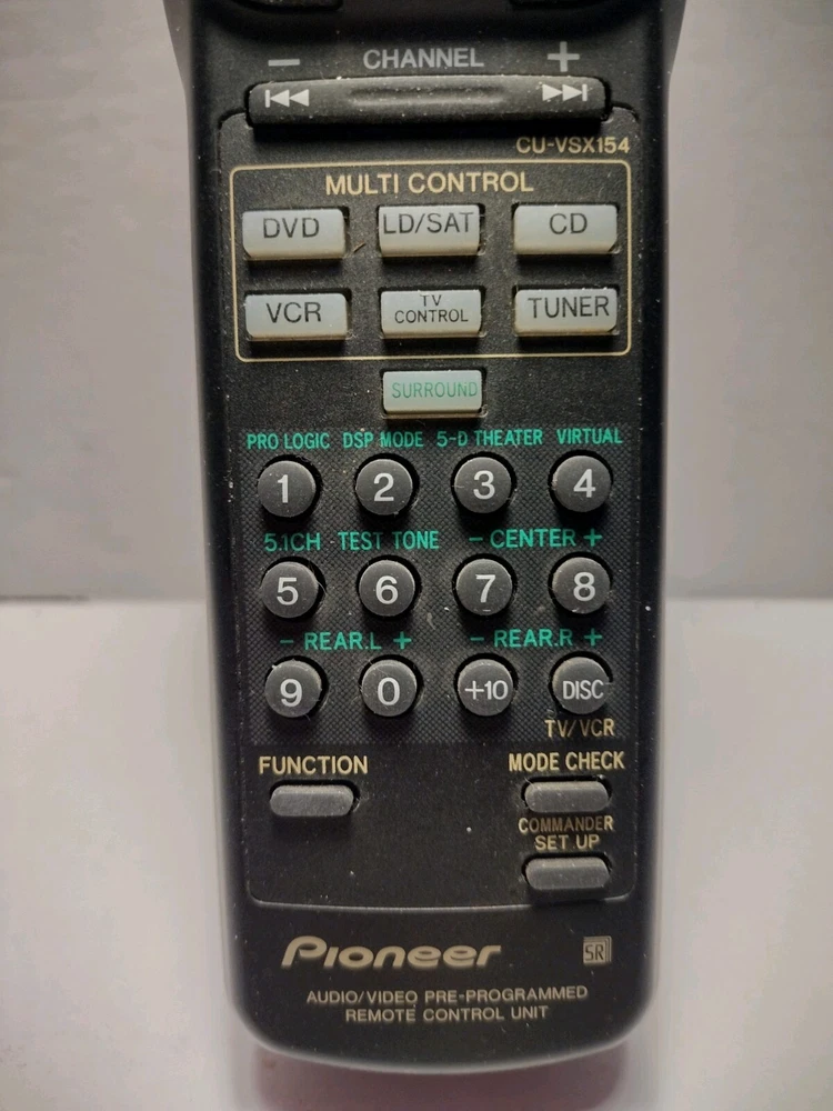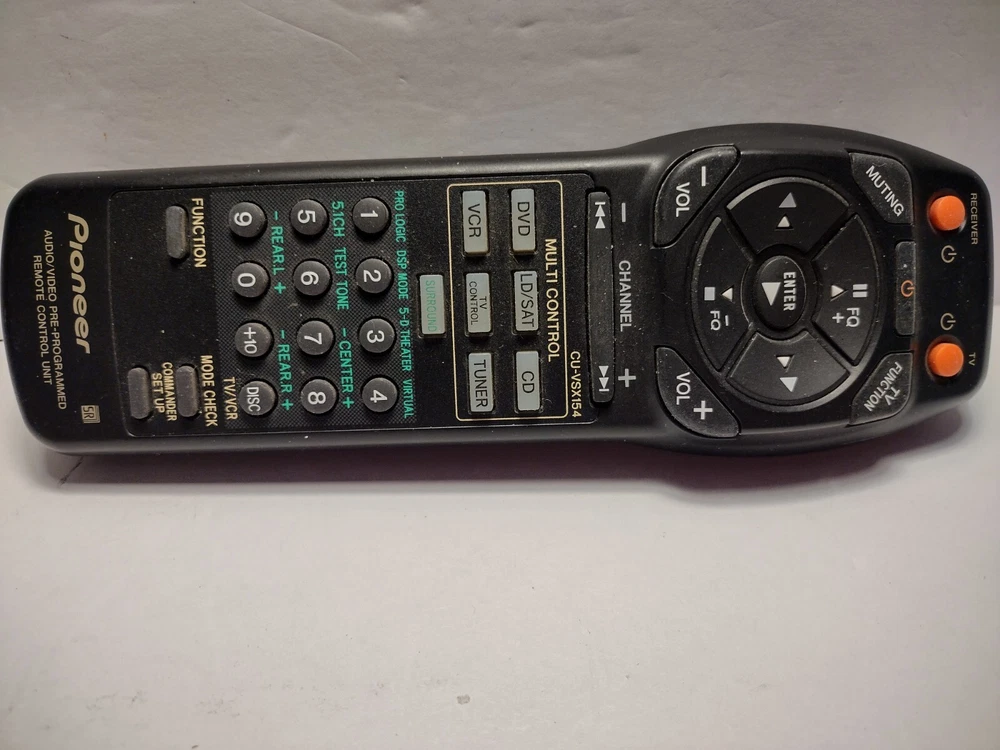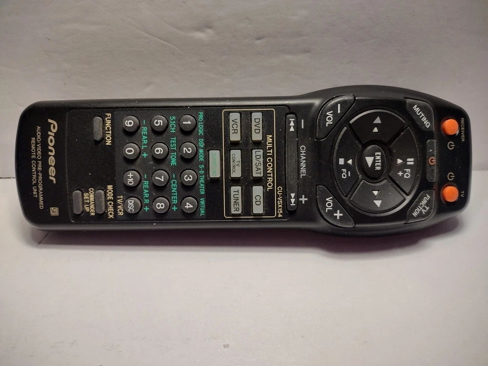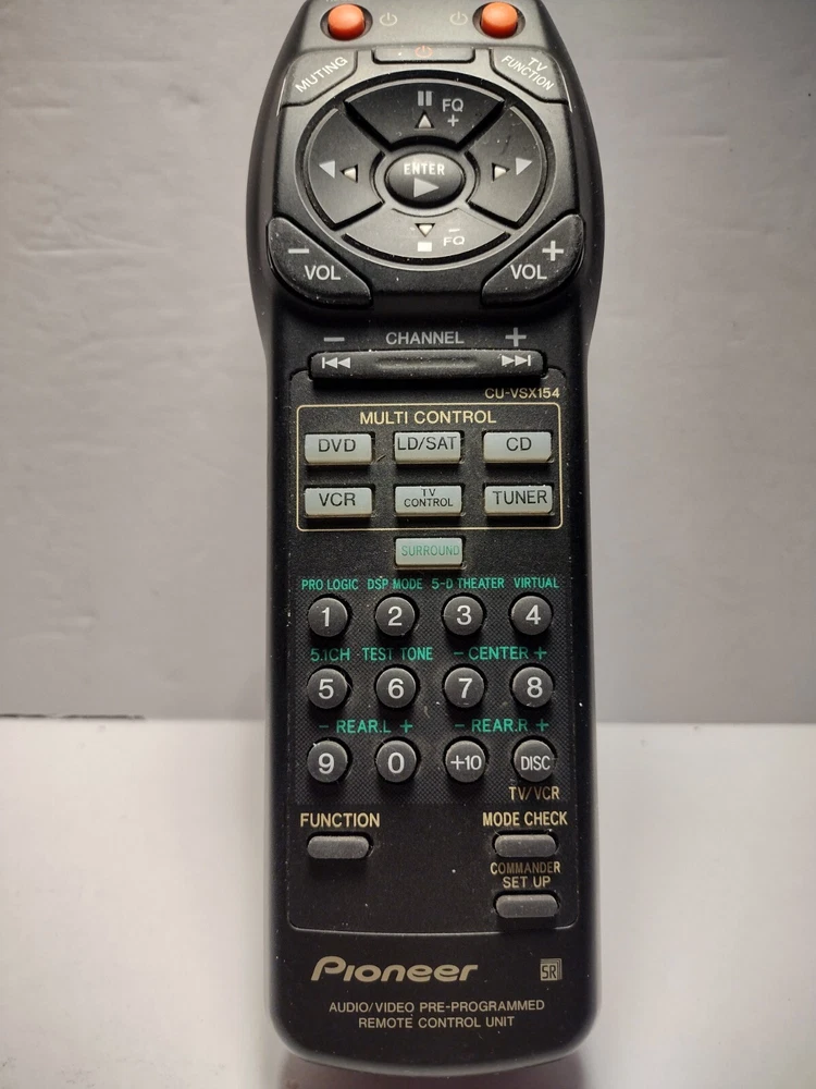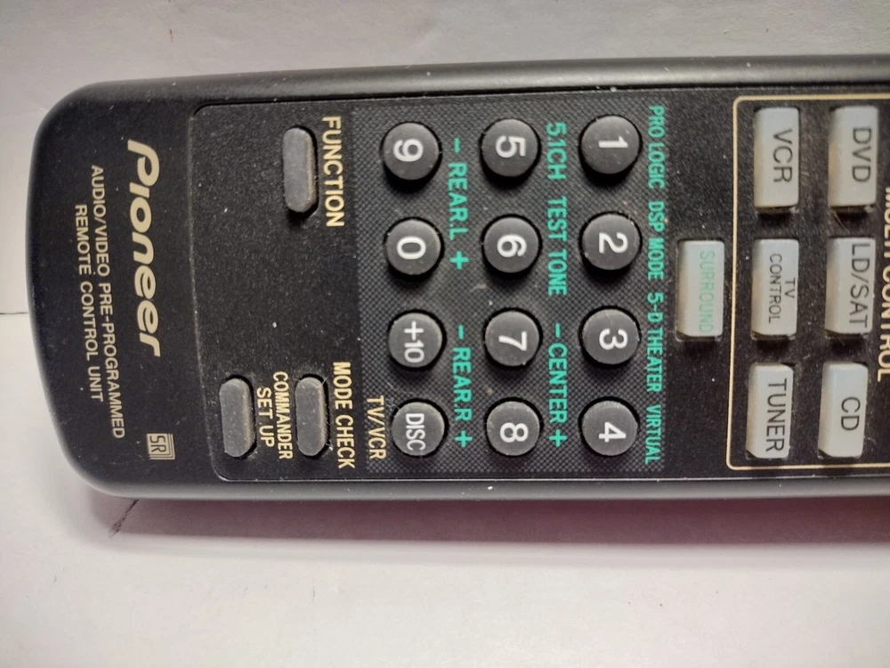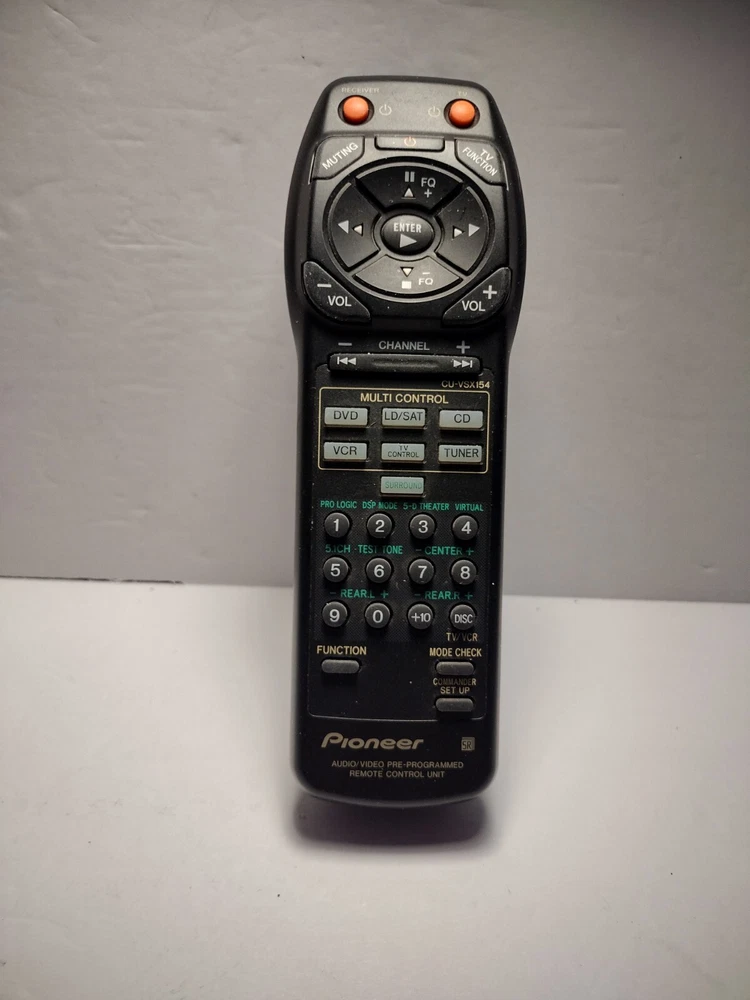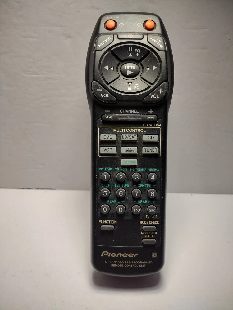 It says it's a pre-programmed pioneer remote, I don't know if they can be reprogrammed or not probably most of them can. pioneer remote control it's supposed to be in a multi-control of DVD led/sat cd VCR wow that's old tuner TV control mode check command setup function got buttons up and down volume TV function power button muting button power button for receiver and power button for the TV set all I know is I put batteries in it and the screen lights up on the front indicating that there's some type of function going on I don't know how to reprogram these or nothing but I'm sure you can probably get instructions off of YouTube I have done it before but it's been so long ago. The product is an original Panasonic remote control designed for controlling electronic devices such as TVs.. I haven't used it on anything to control remotely I don't have a it's fine here I bought a Ford doesn't work it was a pioneer DVD player and it don't work so I have no use for this remote.