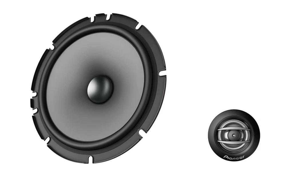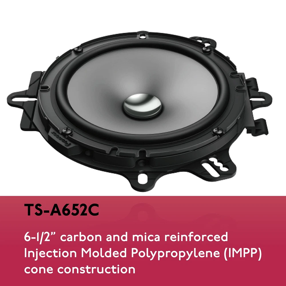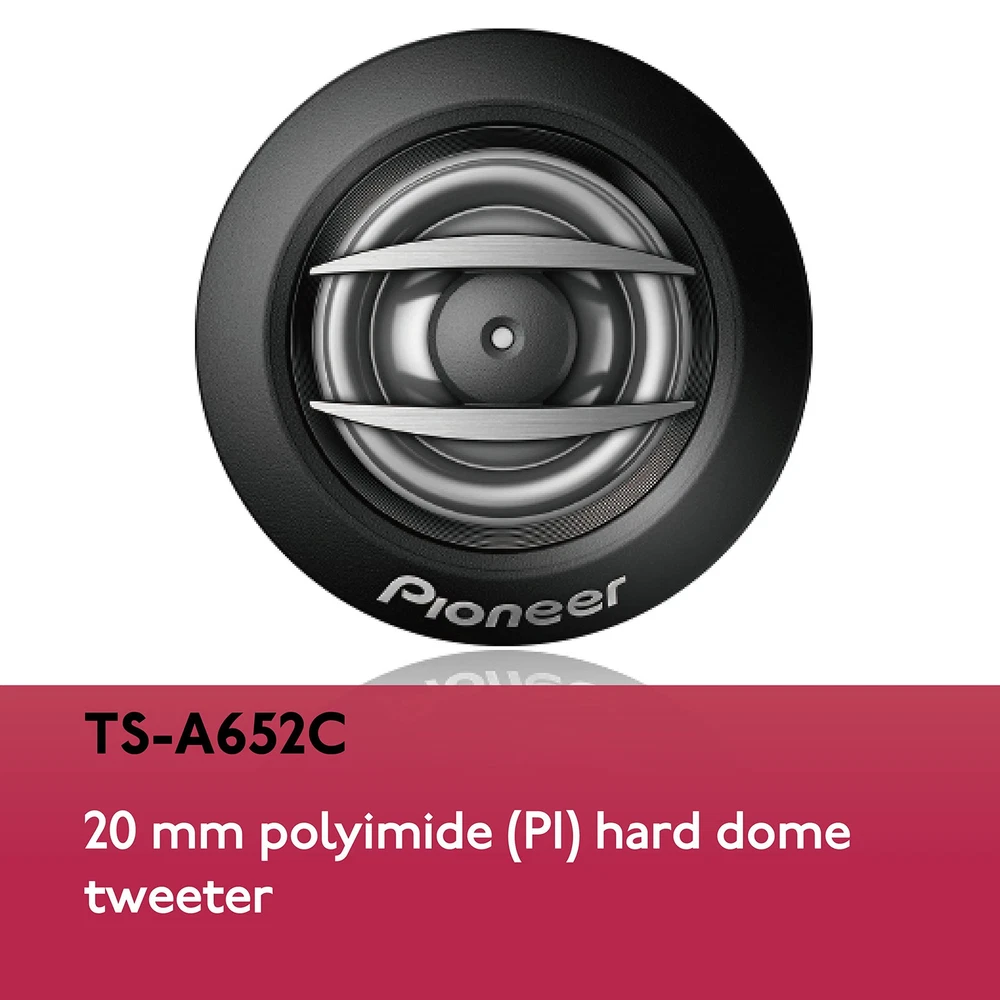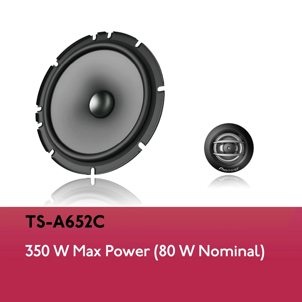 Pioneer TS-A652C, 2-Way Car Audio Speakers, Full Range, Clear Sound Quality, Easy Installation and Enhanced Bass Response, 6.5” speakers 2-Way Component Speaker System - The midrange and tweeter drivers deliver uniform off-axis frequency response optimized for automotive applications where one or more speakers are often aimed away from the listeners’ ears. Power Handling - Maximum power handling of 350 watts and a continuous power handling of 80 watts, these speakers deliver dynamic sound. Crisp highs or deep lows ensure that you can experience a wide range of frequencies with clarity and accuracy. Frequency Response - Receive a rich and immersive sound reproduction across different music genres. This car audio speaker contains a broad range of audio frequencies with a response range of 34 Hz to 49 Hz. Sensitivity - The sensitivity rating of 85 dB ensures that the speakers can produce clear and loud sound even with lower power inputs. This means you can enjoy your music without distortion, even at higher volume levels. Easy Installation - Included with the component system are 6-1/2" multi-fit installation adapters that expand flexibility and improve acoustic performance. Instruction & Operation – Please see the Owner’s Manual for full detail and operation found near the bottom of this page (Technical Specifications). Dimensions 2.63” x 6.5” x 6.5”