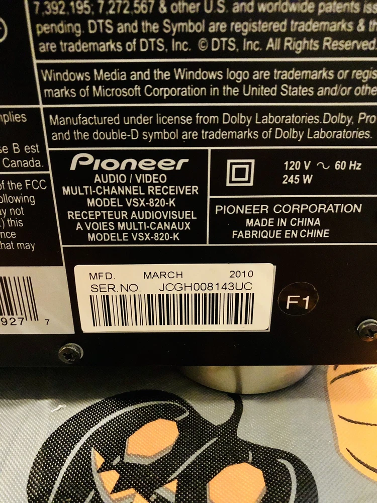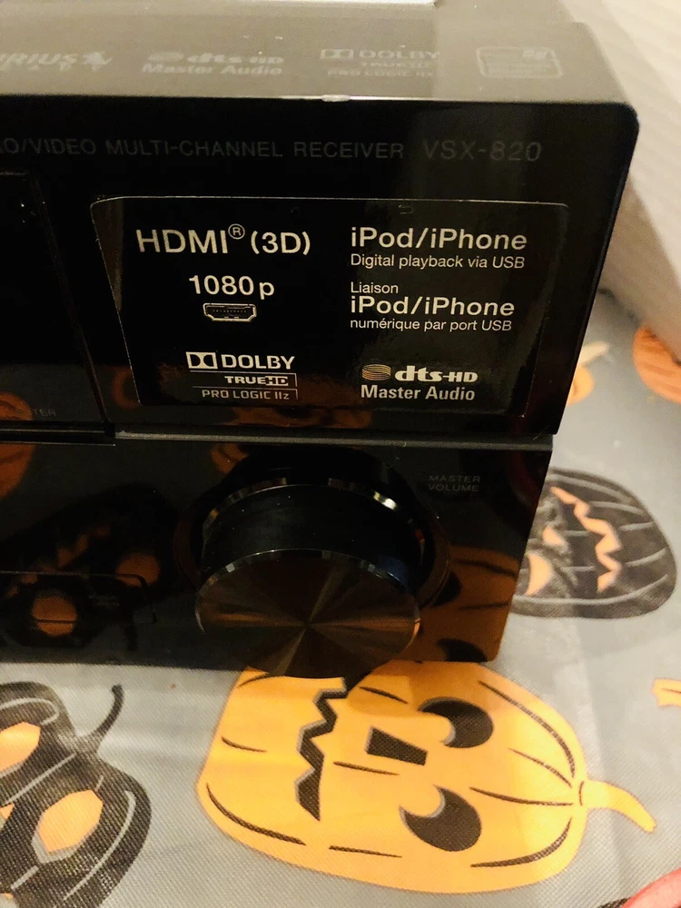 Number of Channels: 5.1 Receiver Combo Features: Digital Tuner, Radio Tuner Color: Black Power: 110 W Features: Digital Brand: Pioneer Audio Inputs: AM, Coaxial Digital, Component, Composite, Digital Coaxial RCA, Digital Optical TOSLINK, HDMI, Optical Digital (Toslink), Pre Out, Stereo L/R RCA, Sub Pre Out/LFE, Two-Channel RCA Number of Inputs: 19 Audio Outputs: Banana Speaker Jacks, HDMI, Headphone Jack, Raw Cable Speaker Jacks, Stereo L/R RCA Type: Home Theatre Receiver Surround Sound Formats: Dolby, Dolby Digital, Dolby Digital EX, Dolby Pro Logic II, DTS, DTS-ES, DTS Neo:6 Supported Modes: AM, FM Band: AM/FM Model: Pioneer VSX-820 Number of Outputs: 6