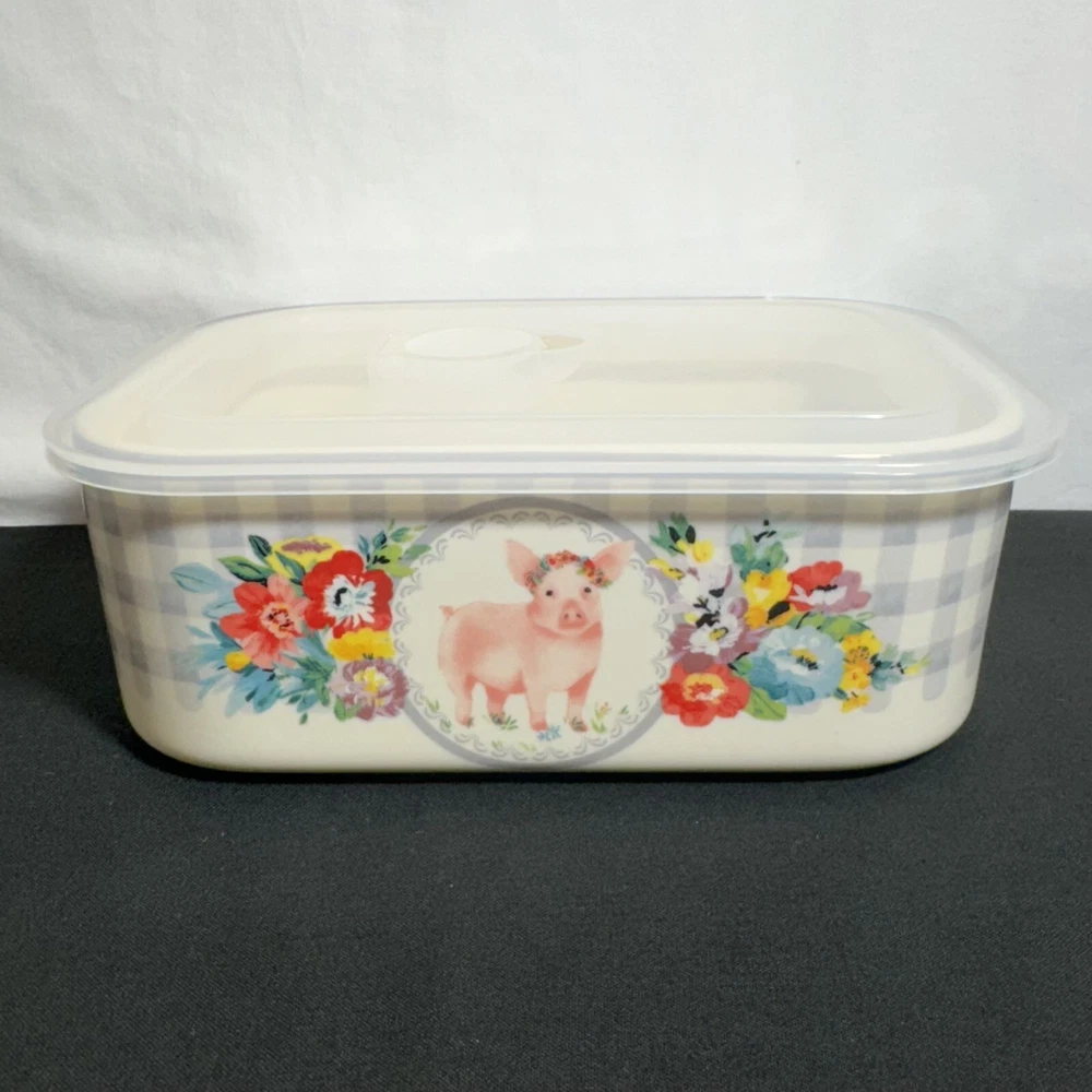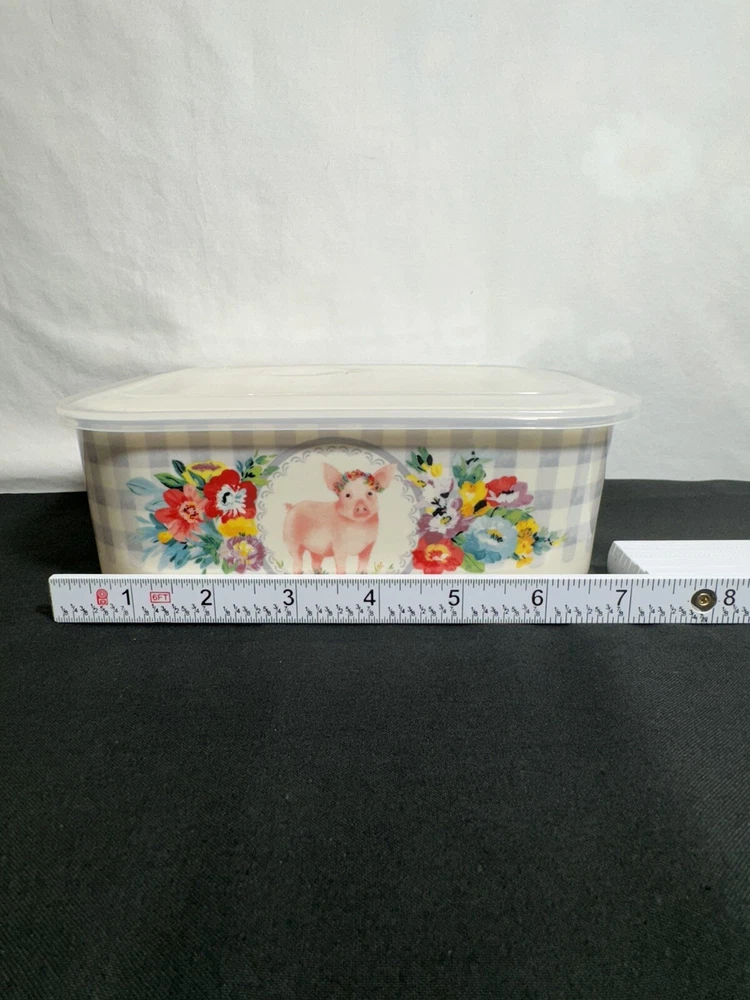The Pioneer Woman Ceramic Food Storage Container in the Sweet Romance pattern is perfect for keeping your kitchen organized and stylish. This rectangular container measures 7.25 inches in width, 5 inches in length, and 2.75 inches in height, making it ideal for storing a range of food items. It features air vents, easy-to-clean surfaces, and is dishwasher safe, ensuring that your food stays fresh. *lid has small crack, not broken off, lid still works perfect. See pictures.