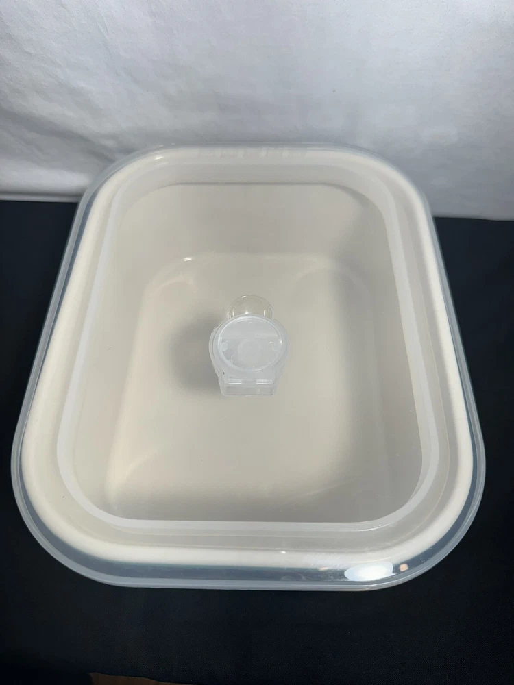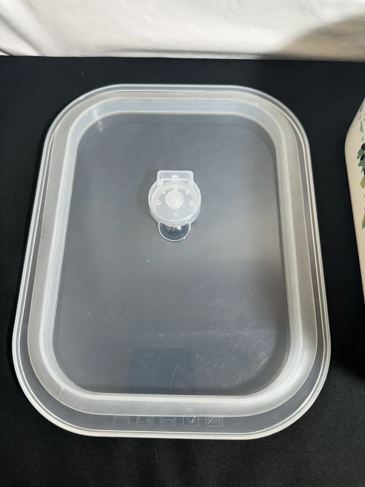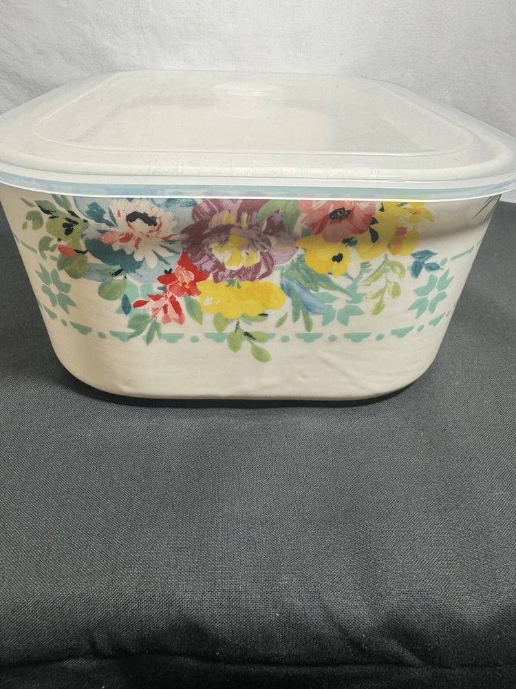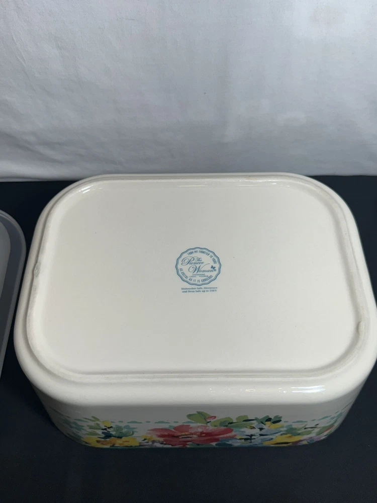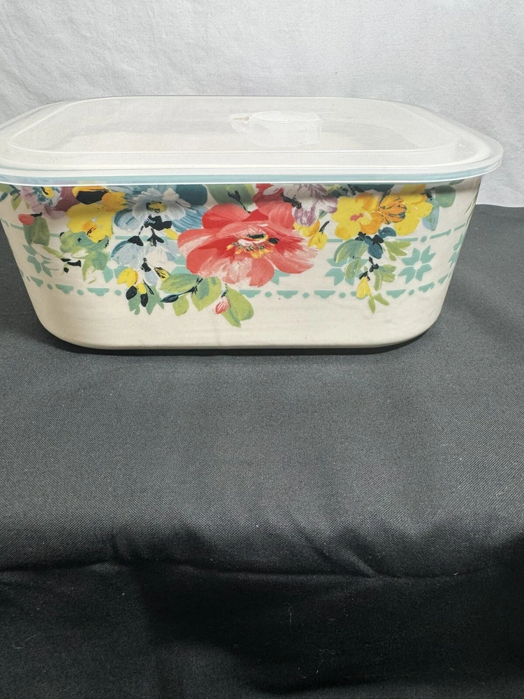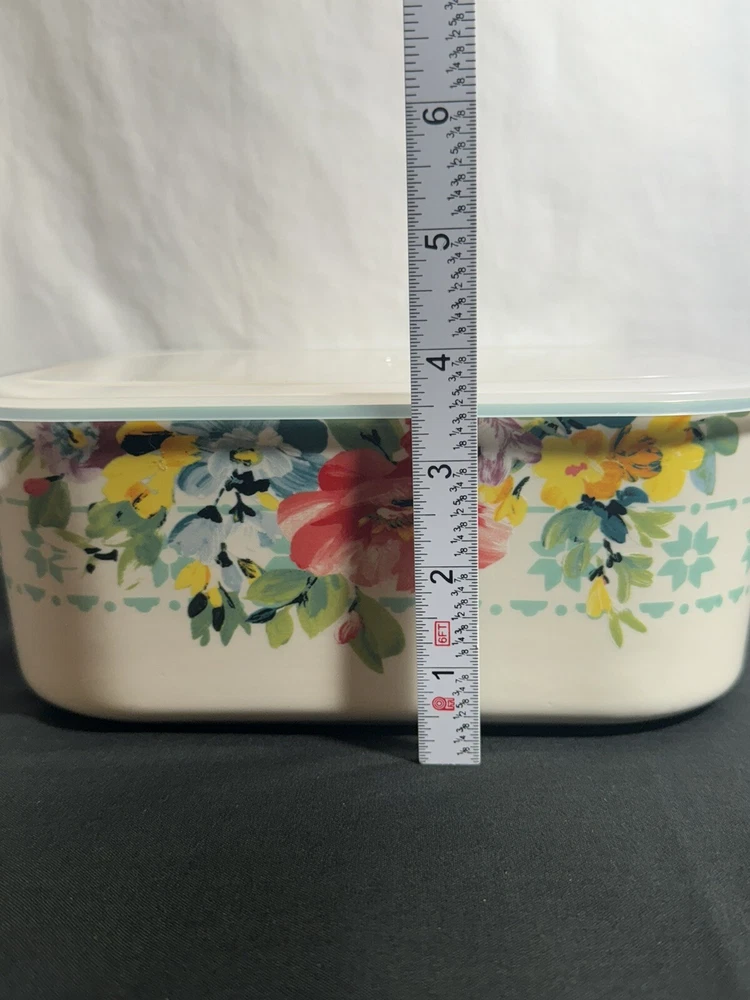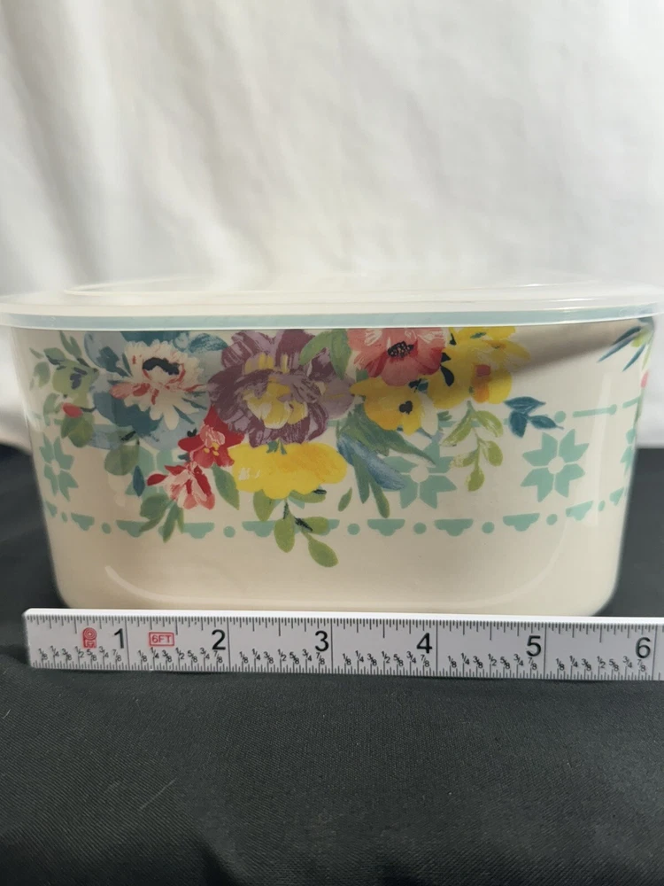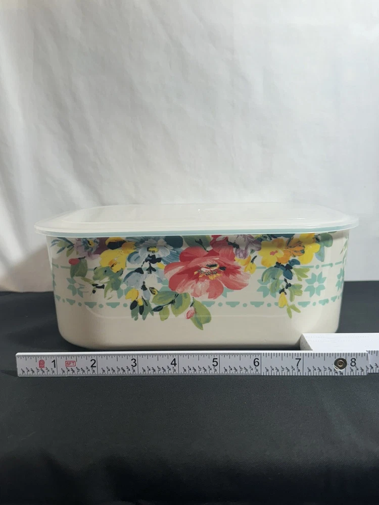Keep your kitchen fresh and organized with this beautiful Pioneer Woman ceramic food storage container, featuring the Sweet Romance pattern. The container has a rectangular shape and measures 8.5 x 6.75 x 3.5 inches in capacity. It comes with a plastic push-on lid and has air vents for easy cleaning. *lid has scratches. Works perfect.