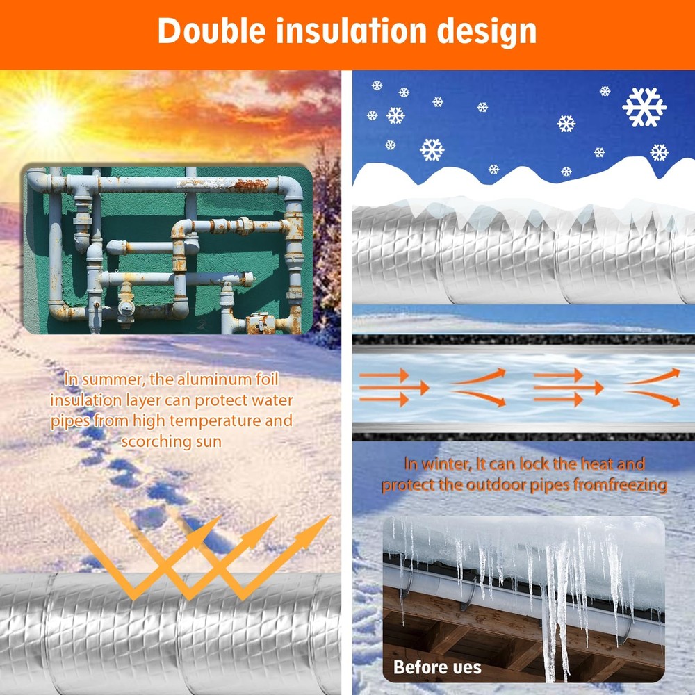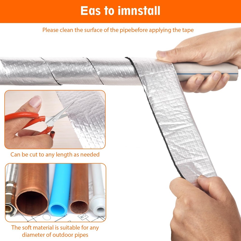 Pipe Insulation Wrap - 2" Wide X 33 Ft Outdoor Foam Silver Description Material: aluminum foil + foam Color: Silver Unit Dimensions: 2 inches wide * 0.2 inches thick * 32.8 feet long Package includes:1 * pipe insulation wrap roll Features: Excellent Thermal Insulation Effect: Our pipe insulation wrap has the advantages of good waterproofing, fireproofing, weather resistance, and so on. It is especially suitable for protecting outdoor pipes from freezing in winter, or damage from high temperature and scorching sun in summer. It can keep hot water pipes insulated, prevent heat loss, and effectively prevent cold water pipes from freezing or getting wet. Pipe Insulation Wrap Size: Our pipe foam insulation wrap is 32.8 feet long, 2 inches wide, and 0.2 inches thick; You can bend it into any shape or cut it to the desired length according to your needs, to suit more different occasions. ALUMINUM FOIL LAYER: There is a layer of aluminum foil on the surface of the water pipe insulation wrap sleeve. The flame retardant performance of aluminum foil can play a good fire prevention effect. It also has the function of heat preservation and heat insulation, which improves the effect of waterproof and antifreeze, and effectively prolongs the service life of the pipeline. The aluminum foil layer is closely attached to the rubber and plastic cotton, and will not shift or fall off. Strong Self-Adhesive: Our outdoor pipe insulation tape has a strong adhesive on the back. Only peel off the film backing and tie the tape around the outdoor plumbing. The tape will stick firmly to the pipe and will not come loose even after a long time. Easy To Install&Remove: The pipe wrap insulation tape is very easy to install and remove. No residue, cutting, tearing, peeling. It can provide fire protection for pipelines, improve waterproof and antifreeze effects, and effectively prolong the service life of pipelines. Product Details: Handling We will ship all orders within 3 business day of payment. Delivery We Do Not Ship Outside of the Continental US. Return Policy All items qualify for returns within 30 days of receipt. Buyer is responsible for return shipping on any item that is not damaged. Feedback We take our reputation seriously, we buy and sell online, so we understand the value of trust. If you are unsatisfied with your order, please contact us and we will work with you to resolve it to your satisfaction.
