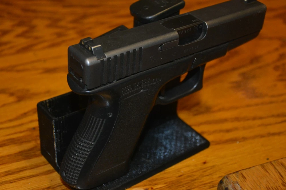 Handgun and Magazine Stand for Glock 17, 19 and 26. Holds 3 magazines and 1 pistol. Will probably fit other 9mm Glocks, but I have not tested them. Great for storage in a safe or at the range. 3d Printed with a heavy infill for extra strength and durability. Items are printed and shipped daily. Check out our other auctions for more great shooting accessories.