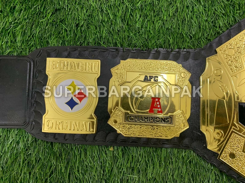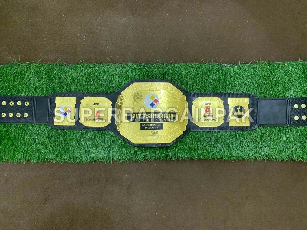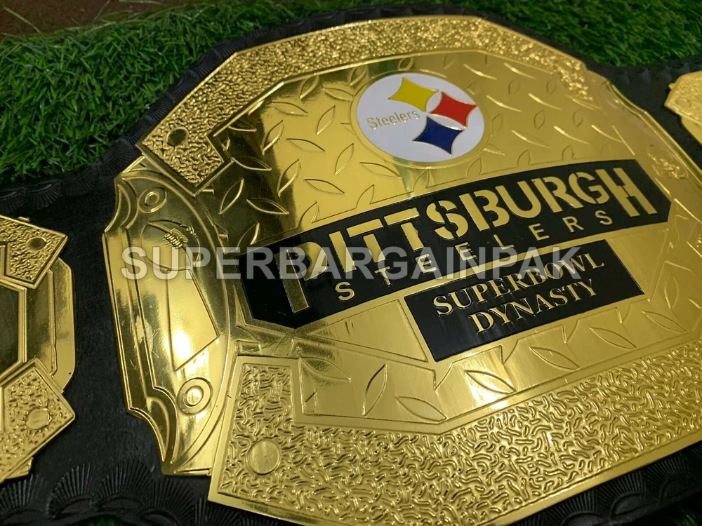 Welcome to our shop ------------------------------------------- We are specialist in manufacturing handmade products:: Our wide range of products include: >>>>Championship Belts WWE | WWF | AEW | UFC | WBC | WCW Product Description ** Pittsburgh Steelers championship belt *** Plate Metal: Brass (Zinc available on request with additional cost) Strap: 100% Leather Largest Waist Size: Fits upto 46'' Belt Length: ~50" Weight: 4.17 lbs | 2.01 Kg Plate Thickness: 2mm (4mm Version available on demand with additional cost) ::The belt is well crafted and manufactured to meet the quality demands of fans:: Get your hands on this marvelous piece now! Note: If you need further details kindly inbox us, we will try to be as responsive as possible. ------------------------------------------- Return Policy: Generally we don't have much complains on our products and we make sure to 100% satisfy our clients. We send the product in well Bubble Wrapped packaging so there is highly unlike chance of getting damaged item. In case there is a damage, we will try to give partial refund or you can ask for full refund within 30 days after returning the belt to origin. NOTE: 1. If you have placed the order by mistake or you have purchased a wrong item then we are not going to refund that. 2. Buyer will pay the shipping fee of returning the belt. ------------------------------------------- Happy Shopping! :)