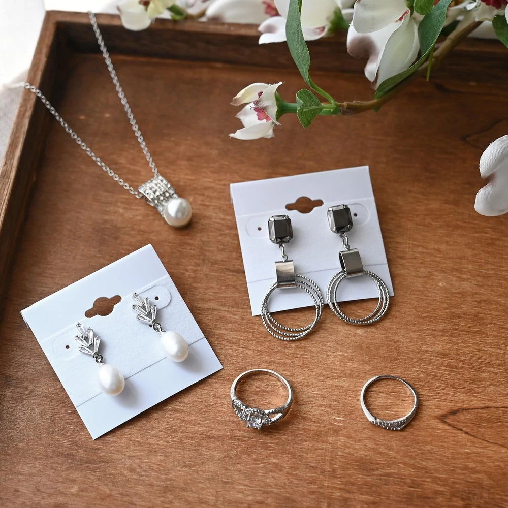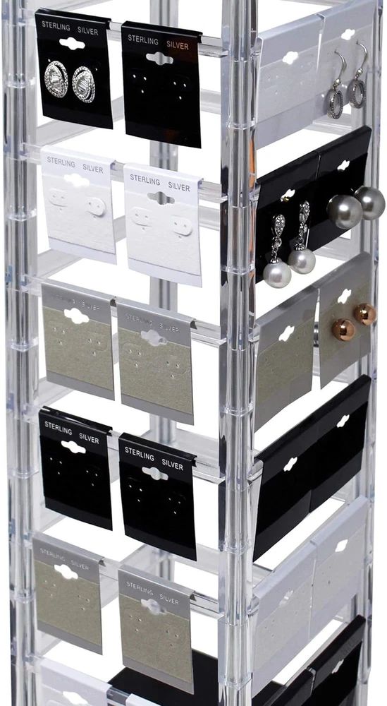 HANGING EARRING CARDS - 100 high-quality hanging earring cards with 6 holes to hold various earrings such as studs, clusters, drops, hoops, chandeliers, Halo, huggie, and climber earrings. EARRING DISPLAY- Elevate your jewelry display with our sophisticated White Velvet Fabric Earring Cards. These elegant fold-out tab earring cards offer both style and security, all while boasting a luxurious black velvet fabric for an undeniably sleek aesthetic. Earring Organizer: Our earring cards can efficiently store or display earrings, offering space-saving and organizational benefits. EARRING ORGANIZER: We provide the best hanging earring cards. With two decades of experience in the United States market, we have gained a deep understanding of our customer's requirements, allowing us to tailor both the quality and design of our products to meet your needs. MATERIAL & SIZE - Flocked plastic; Overall: 2"W x 2"H Official MOOCA product. Accessories are NOT included Product Description FEATURES Perfect and elegant earring cards for hanging earrings. Featuring precut 6 holes which are suitable for a variety of earrings. Perfect for organizing your earring in place. Made of high-quality plastic and come in a pack of 100 pieces. Elegant and sophisticated earring cards Sleek and simple This plain white plastic earring card holder is sleek and simple. Illuminating your earrings on display. Pack of 100 pieces These cards come in a pack of 100 pieces for multiple earrings. For a variety of earrings. Efficient and practical design The earring card can be hung in 2 different ways. Either on a rack or a hook. Perfect for displays This earring card is perfect for displaying at trade shows, shops, etc. Easy to use and saves space. 100 Pcs Hanging Earring Card Holders, Plain White Overall: 2"W x 2"H each