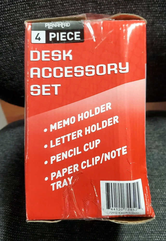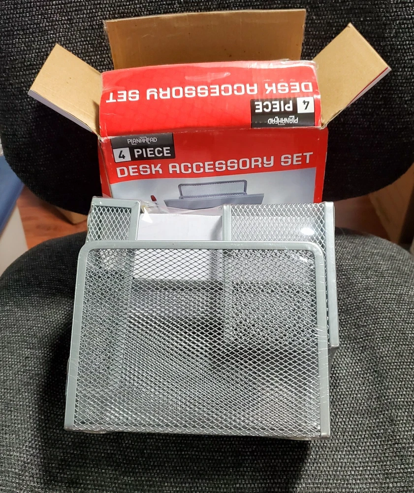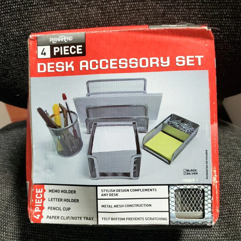 Stylish design complements any desk. Metal mesh construction. Felt bottoms prevent scratching New in box (box has been damaged, but accessories inside are not damaged) Box has been opened and taped closed after photos taken The set you will receive is the one shown in photos 2-5 Silver metal mesh construction with felt bottoms Set includes memo holder, letter holder, pencil cup, and paper clip/note tray UPC: 744120729525 All of our items are stored in and shipped from a clean, smoke-free, and pet-free environment. We describe our items to the best of our ability. We are not experts on everything we sell. If you see an error in one of our listings, please let us know so we can correct it. Retirement Sale! We are selling off our inventory in preparation for retirement. Check out our other listings for more great deals! Thank you for shopping at the eBay store of Luckystar Enterprises, Inc!