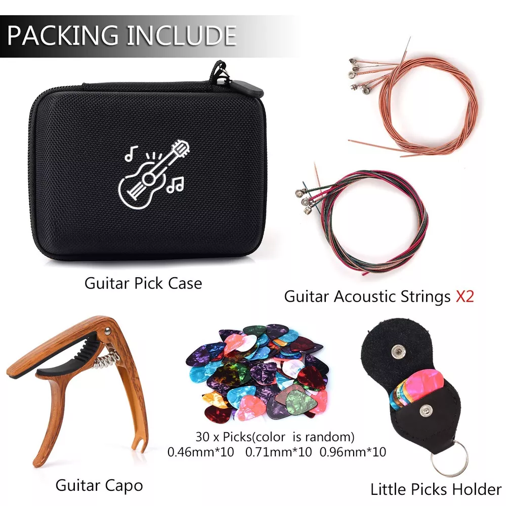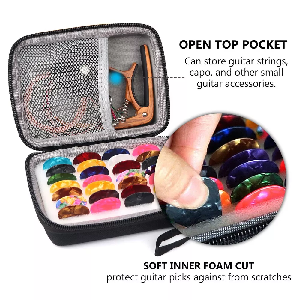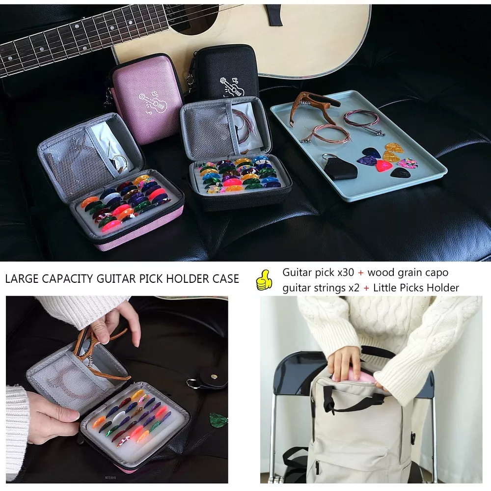 PlasMaller Guitar Picks Holder Case Bag Set, included Upgrade Capo + Guitar Strings + 30pcs Acoustic Electric Guitar Colorful Picks + Little Picks Holder (Black) Product Details Item Weight: 7.8 ounces Package Dimensions: 6.26 x 4.61 x 2.24 inches Item model number: LICHUAK-501-01 Date First Available: January 18, 2021 Color Name: Type 2 Compatible Devices: Guitar, Ukulele, Banjo Guitar Pick Thickness: Medium Material Type: Ethylene Vinyl Acetate (EVA) Size: Small DESIGN & FABRIC- Made of hard EVA material with good water resistance and dustproof, soft interior cushions the impact of your guitar picks STRUCTURE- 6 x 4.7 x 2.4 in, small size allows you to easily put guitar holder in your bag; With a sturdy hand strap makes it easy to carry; Smooth strong zipper easy to open and close; Soft inner foam cut fits your picks snug and more stable; Inside extra mesh pocket allows you to store the tuner, capo, strings, straps PACKAGE- Included Quality 30 pcs Celluloid picks (3 Different Thicknesses - Thin 0.46mm * 10, Medium 0.71mm * 10, Thick 0.96mm * 10; Color is random) + 1 extra little picks holder + 1 Upgrade Capo + 2 Guitar Strings (Each set including 6 strings) PRACTICAL- Large capacity, this storage case can hold 50+ picks, enough space for all your picks and other accessories , keep your guitar accessories well organized and safety IDEAL GAME GIFT- Whether it is a party or a trip, this guitar kit holder set will be a good choice; Also is a wonderful gift for kids, friends or guitarist