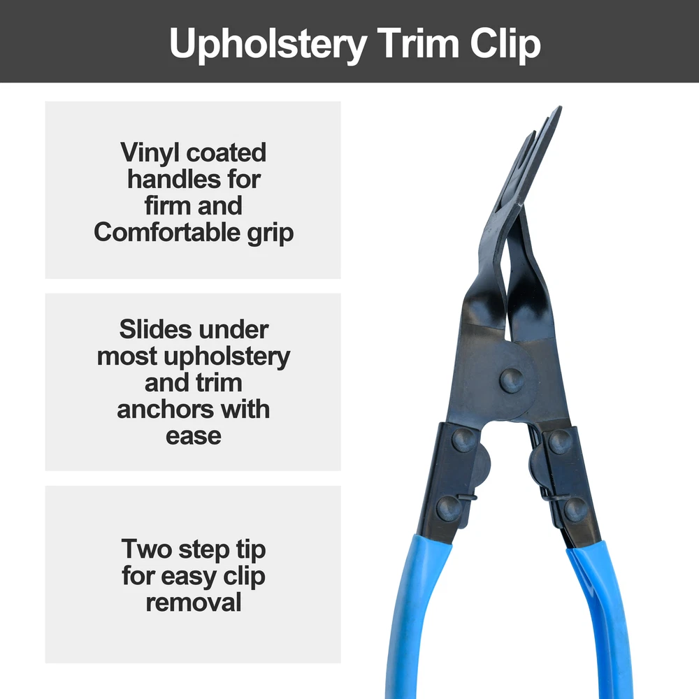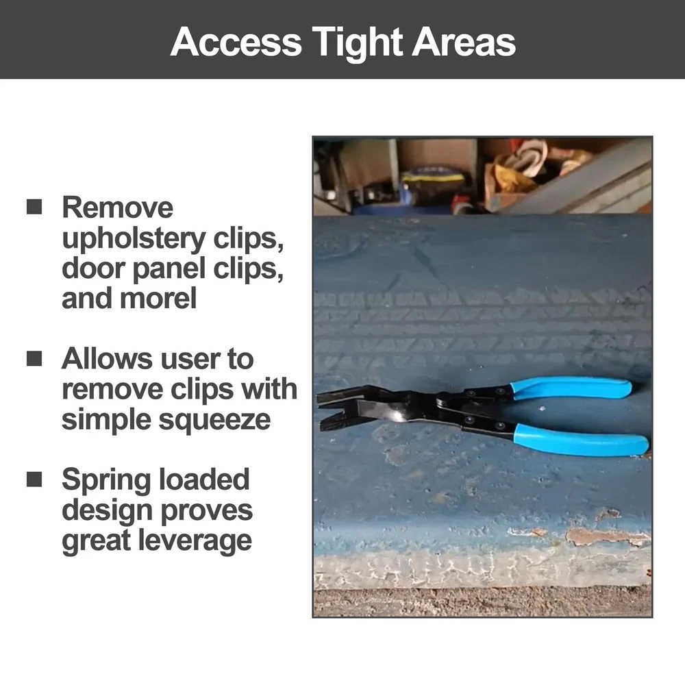 MKT007 Panel Clip Pliers, Clip Removal Tool, for Car, Automobile Interior trim panels or pieces PRODUCT DESCRIPTION About this item Easy to opperate, our clip removal pliers feature a spring loaded design to enable you to remove clip style fasteners with a simple squeeze of the handle. These pliers provide smooth removal of panel clips. Ratchet handle lock holds pliers in clamp-open position for easy removal and installation. Ideal for removing door upholstery clips, door panel clips, and many other standard trim anchors and clips. Comfortable Grip that is dipped in soft, non-slip, PVC to provide easy an easy to hold, yet secure grip. The pliers work in tight spaces and easily slide under most standard upholstery clips and anchors, preventing damage to the surrounding trim. MKT007 Panel Clip Pliers, Clip Removal Tool, for Car, Automobile Interior trim panels or pieces. .................................................................................................................................................................... Upholstery Trim Clip Removal Pliers Unique two-blade tip for added support under the clip head. This lets you remove panel clips without damage. Simply squeeze the pliers to pop the clips out. Features Pliers for easy removal of panel clips. Two blade tip adds support under the clip head. Just squeeze the pliers and the blade pops the clip out. Dipped plastic grip handle keeps hands comfortable. Ratchet handle lock holds pliers in clamp-open position for easy removal and installation. Multi-Use Ideal for removing door upholstery clips, door panel clips, and many other standard trim anchors and clips Comfortable Grip Soft Comfortable Grip Soft, non-slip handle provides a comfortable secure grip. Easy Operation Spring loaded design enables you to remove clip style fasteners just by squeezing the handle. The pliers work in tight spaces and easily slide under most standard upholstery clips and anchors, preventing damage to the surrounding trim. Video For This Product Video will open in a new window -------------------------- SHIPPING TERMS All items will be shipped to buyer's eBay address. Before you pay, please make sure your address in eBay matches the address you would like us to ship to. All items to domestic will be shipped with tracking information within 1-2 working days(except weekend and holiday) upon receipt of payment. In most cases, shipping to domestic takes 3-7 business days . We try our best to provide you the most reliable, affordable way of shipping service. But sometimes delivery is highly depended on the local customs and post service. If you do not receive your item on time, please contact us immediately for further assistance. We will be responsible for any damages or losses incurred in the shipping process. There is no local pickup service, no third party shipping carrier will be used. listings with shipping and handling charge: the charge covers mailing, packing, warehouse and distribution costs, not postage only. -------------------------- RETURN If any item is defective upon receipt, please contact us for the return address, return is accepted within 30 days after the buyer receiving the item. Returned item has to be in its original condition. After receiving the return we will make a replacement depends on our available stock, if not available, a refund will be issued. -------------------------- CONTACT US We care about our valued buyers, if you have any questions, our Customer Service staffs will be very glad to help you. We try our best to reply to your emails as soon as possible, however, due to high volume of daily incoming emails and time zone difference, we may not be able to reply your emails immediately. Please allow 24 business hours for us to response. About item:For the functional products in our shop, we make sure that the functions are the same as description, but the actual color and shape may looks a little different from pictures because of the technical improvement and manufacturing variance. Please be advised before you bid. .
