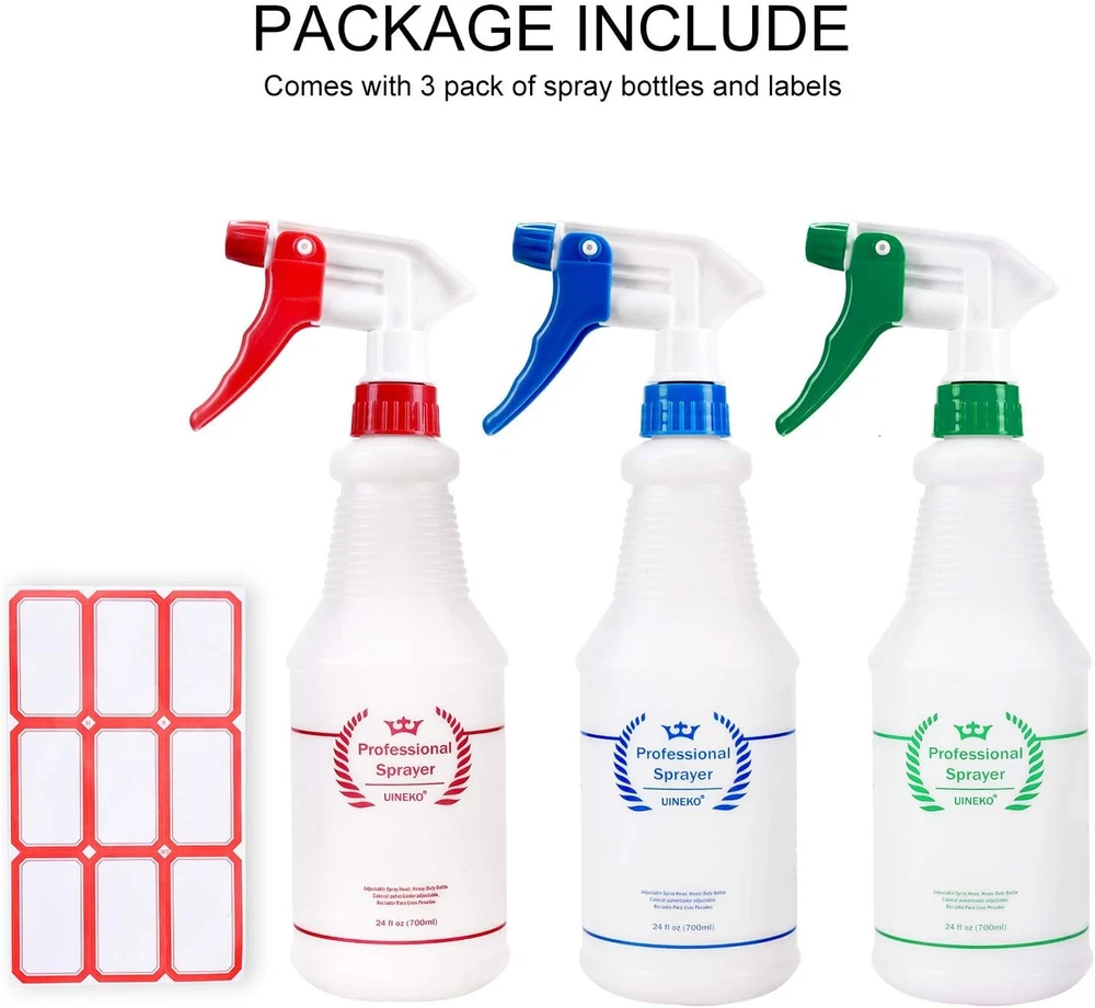 DURABLE BOTTLES WITH 3 COLORS - Our 24 ounce (about 700 ml) heavy duty spray bottles are made from HDPE plastic, recycle code # 2, which is chemically resistant, safe for chemical solutions. The empty spray bottles are with 3 different colors, also on the side of each bottle is a checklist to stay organized and remain informed as to what liquids the bottle contains. (Comes with labels to meet your need) UPGRADED SPRAY HEAD & LEAK PROOF - Our professional sprayer features a long lasting polypropylene spray head, tight and secure cap closure, internal cap gasket, 302 stainless steel spring and a precision valve and piston for a no clog and no leak experience; A proven and reliable no leak venting system primes quickly and stays primed. ADJUSTABLE NOZZLE - From a fine mist to a solid stream, the sprayer can be easily adjusted to suit your needs. Be prepared to tackle any job with a simple twist of the nozzle! Avoid waste with our extra-long tube that'll spray every last drop out! HOUSEHOLD-COMMERCIAL-INDUSTRIAL USES - Our plastic spray bottles is for multi purpose uses, each bottle is BPA-free, use them for food spraying, cleaning solutions around the house, pet, cat, lawn and garden, misting and watering plants, succulents, herbs, ironing, laundry, car cleaning, janitorial. Make your own homemade diy cleaner mister or just use with water to cool yourself. BETTER TRIGGER DESIGN - The unique design 3-finger trigger makes your fingers rest easily on it and the bottle fit comfortably in your hand, eliminating hand fatigue; The ergonomic neck gives you a comfortable grip; Pull trigger has a short effortless squeeze reducing finger fatigue. Product Description This essential set of four, 24 oz spray bottles is fantastic for both home and commercial use. The adjustable spray nozzle coupled with the original 100% no-leak mechanism will set off your cleaning or gardening tasks to a perfect start. Buy economy sized liquid cleaning products in bulk for less and decant the contents into these trusty home use bottles. The 24 ounce capacity plastic bottle is perfect for all natural household looking to create their own cleaning recipes for a healthier home. Try a homemade drain cleaner or air freshener, dusting spray or furniture polish! Keeping a few labeled bottles handy around the house enabling you to use for DIY cleaners to clean windows, mist plants, or spritz over bread dough before baking… whatever it is you decide to fill these bottles with, you are sure to get hooked! Our professional spray bottles is extremely durable and comes with the following 5 unique features: Adjustable Nozzle 24 oz Perfect Size Chemical Resistant Unique Design 3-Finger Trigger Measurements ADJUSTABLE NOZZLE Easily adjust between 3 trigger settings including mist, stream and off by simply turning the nozzle. BETTER TRIGGER The unique design 3-finger trigger makes your fingers rest easily on it and the bottle fit comfortably in your hand, eliminating hand fatigue. COMFORTABLE DESIGN The ergonomic neck gives you a comfortable grip; Pull trigger has a short effortless squeeze reducing finger fatigue. CHEMICAL RESISTANT Durable material makes sure that the bottle doesn’t deteriorate due to chemical exposure or harsh substances. DESIGN FOR COMFORTABLE WORKING 24oz great size, not too big and can hold enough liquid; 3 finger sprayer for a better grip HOUSEHOLD/COMMERCIAL/INDUSTRIAL USES Our multi purpose spray bottles can be used for cleaning solutions, grooming, planting and more. PACKAGE INCLUDE 3 * Plastic Spray Bottles 1 * Label (with 9 labels) Note: If the liquid contains powder, it may cause the nozzle or the tube to become clogged, so it is recommended to shake the liquid fully evenly before use. Ensure the cap is screwed on tightly. The bottles are resistant to leaking, but it's best to avoid leaving them on their sides when not in use.