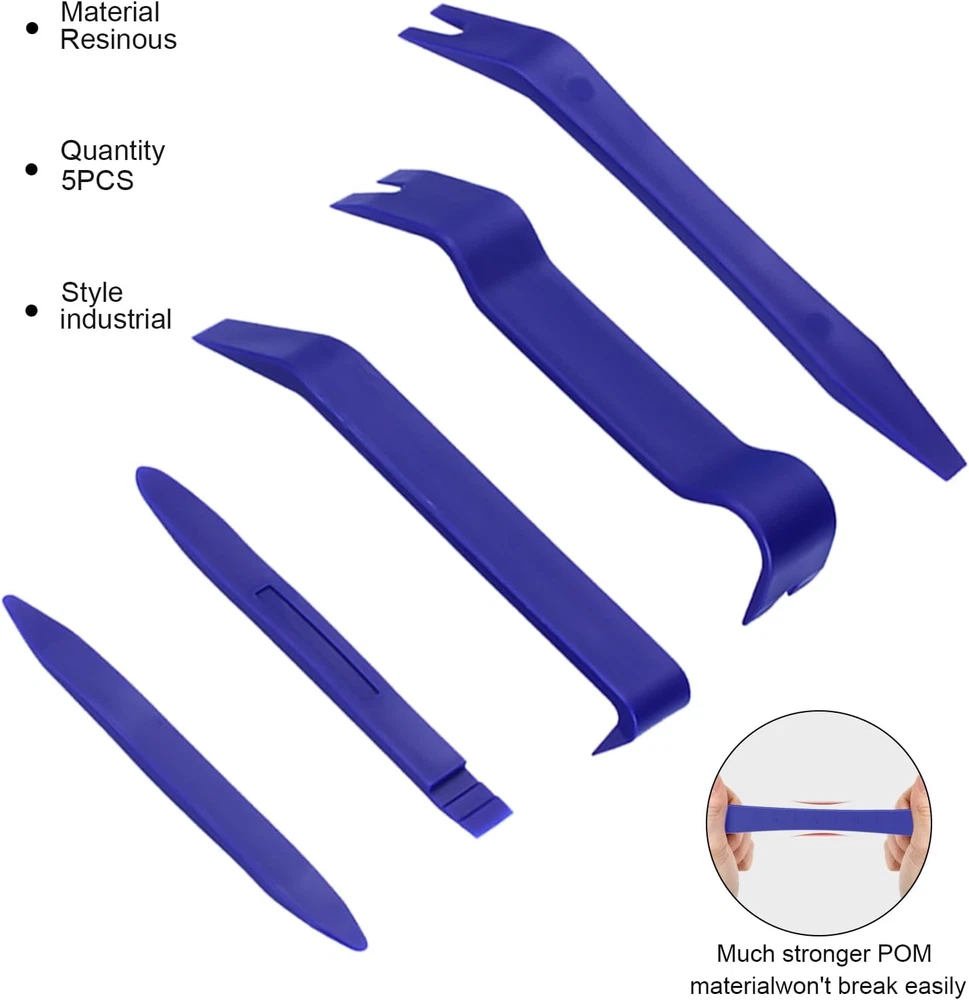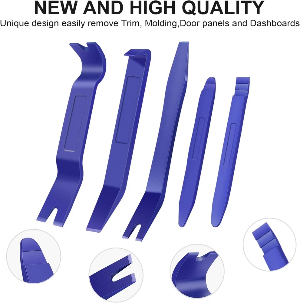 No Marring and No Scratch - The sharp and clean edge of the trim removal tool ensures the good effect of using and curved, Ultra-thin clip head can reach the confined areas without pry off the trim. Easily install or remove car accessories without damaging the car. ERGONOMIC DESIGN - The trim removal tool is ergonomic design with super lightweight and easy handheld features. The anti-slip and thick handle can prevent it from falling off from your hand when in use, allows you to use with less effort and improve efficiency. - HIGH QUALITY - Made of super durable plastic nylon material with high level craftsmanship, non-toxic and eco-friendly designed, sturdy enough for long-time usage. Super lightweight and portable, you can store anywhere or carry in your bag when you're not in use. - UNIVERSAL CAR PANEL DOOR TRIM REMOVAL SET - Suitable for disassembly and assembly of automotive or marine parts such as fasteners, door panels, vehicle dash radio, instrument panels, clips, moldings, base plates, etc. - PACKAGE INCLUDES - There are 5pcs different kinds of trim tools, perfect for professionals and beginners doing any care modifications. Buyer Note: If you are satisfied with our service, we appreciate you leaving us a positive feedback and 5 star rating review! Your opinion is important to the success of our business. If you are not satisfied with the product or have not received the product for more than 35 days, please contact us to resolve, we will do our best to solve. We are sure to come up with a satisfactory solution. Please contact us first before leaving cold feedback or good feedback of 1-3 stars and opening the case. We'll do our best to solve your problem. Because we believe that everything can be solved through communication. Thank you very much!