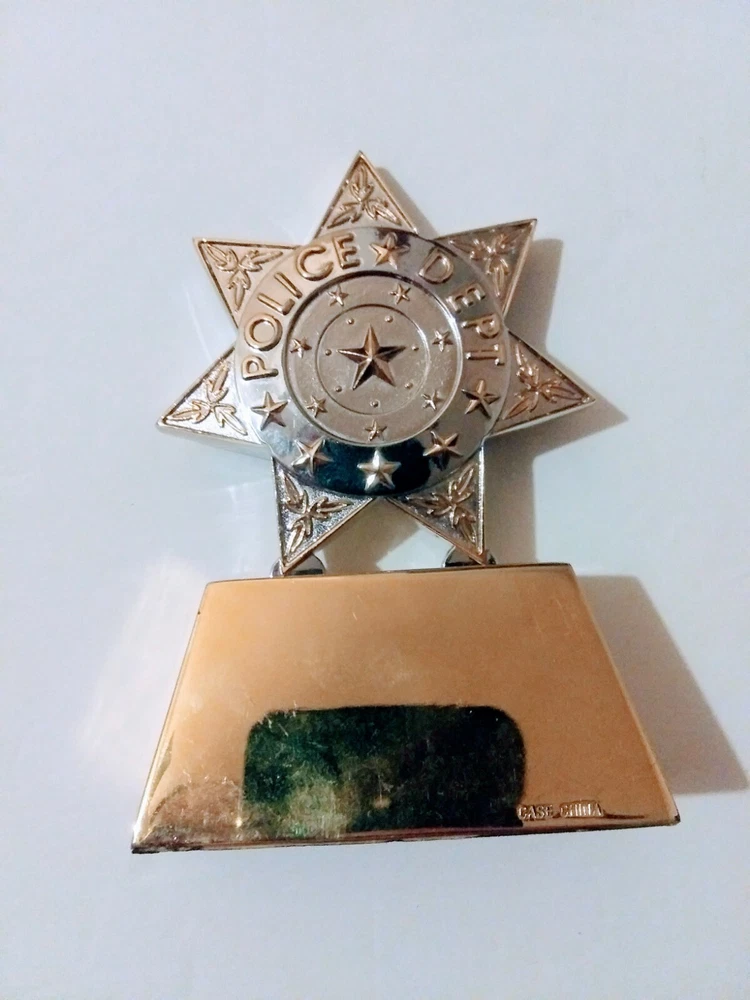 Platinum Brand Police Badge Mantel Clock - Battery Not Included. Stands approximately 4 inches tall by 2.5 inches wide. No battery included. Uses SR626SW watch battery. Ships out same day when you order.