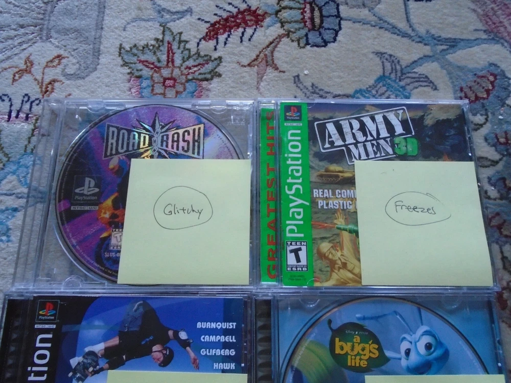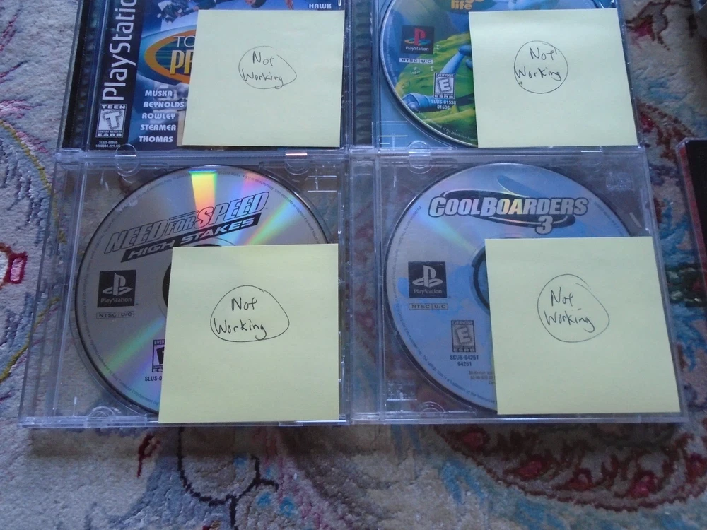 Video game accessories bundle includes: Lot of PS1 console, memory card, and several game discs. The items are NOT WORKING PROPERLY, FOR PARTS OR REPAIR - read below for details Functionality and Cosmetic Condition: The PS1 console turns on, and it will read discs, BUT the spindle is loose and keeps coming out when you remove discs (see photos). The memory card does not work. The games were tested on another PS1 console. Road Rash works, but it glitchy. Army Men 3D freezes. The rest of the games do not work. There are lots of scratches on the discs. Everything is for parts, repair, or repurpose. The photos are of the actual items being sold. We only accept returns if the items were not described correctly. Thank you for viewing our auction and good luck bidding!