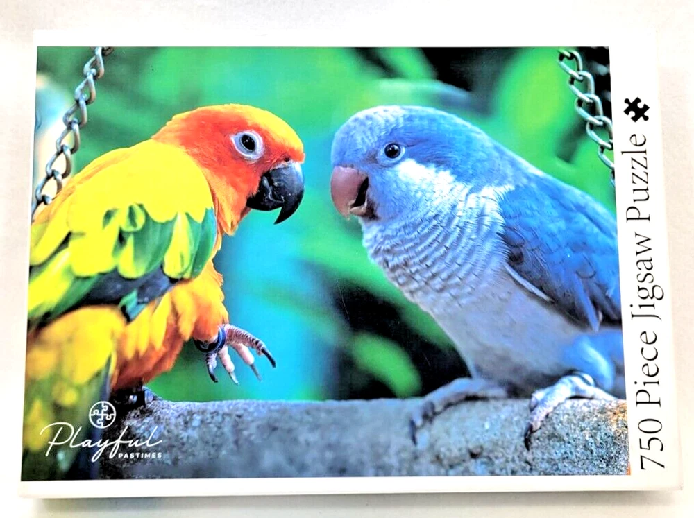 This Playful Pastimes Love Birds Jigsaw Puzzle features 750 pieces of vibrant, multi-colored birds perched on a branch. Measuring 27 inches by 20 inches when completed, it offers a fun challenge for ages 8 and up. The cardboard pieces have an anti-glare matte finish for easy viewing and are interlocking for a secure fit. This puzzle comes from a smoke-free household and is perfect for bird lovers and puzzle enthusiasts alike. Its theme and design make it a great addition to any puzzle collection. Get ready to spend hours piecing together this beautiful image of love birds in their natural habitat -- Being together. Doing puzzles has some hidden benefits . Excellent qualities : Cultivate concentration, patience, and temper your will Movement development : Train hand-eye coordination and precise small movements Spatial intelligence : Improve visual discrimination of colors and shapes Critical thinking ability : Understand the relationship between parts and the whole, and draw inferences from one example to explore the future Relaxes your mind : Relieve work pressure and release yourself Brain development : Enhance memory and may help prevent or slow brain degeneration We did not work the puzzle or count the pieces, but we verify the number count at your request. Each item we ship is carefully packaged to prevent any damage and is shipped immediately with tracking.
