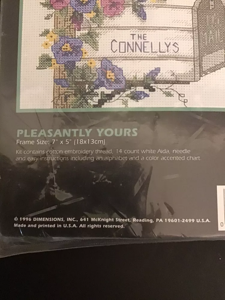 PRODUCT IS OPEN AND 1 Line completed. The product is a vintage 1996 Counted Cross Stitch Kit by Pleasantly Yours. The kit features a Dimensions model number 6718 and allows you to create a cross-stitched design measuring 5 inches by 7 inches. This kit would appeal to crafters interested in needlecrafts and embroidery, providing all the necessary materials and instructions to complete the project in a pleasant and artistic way.