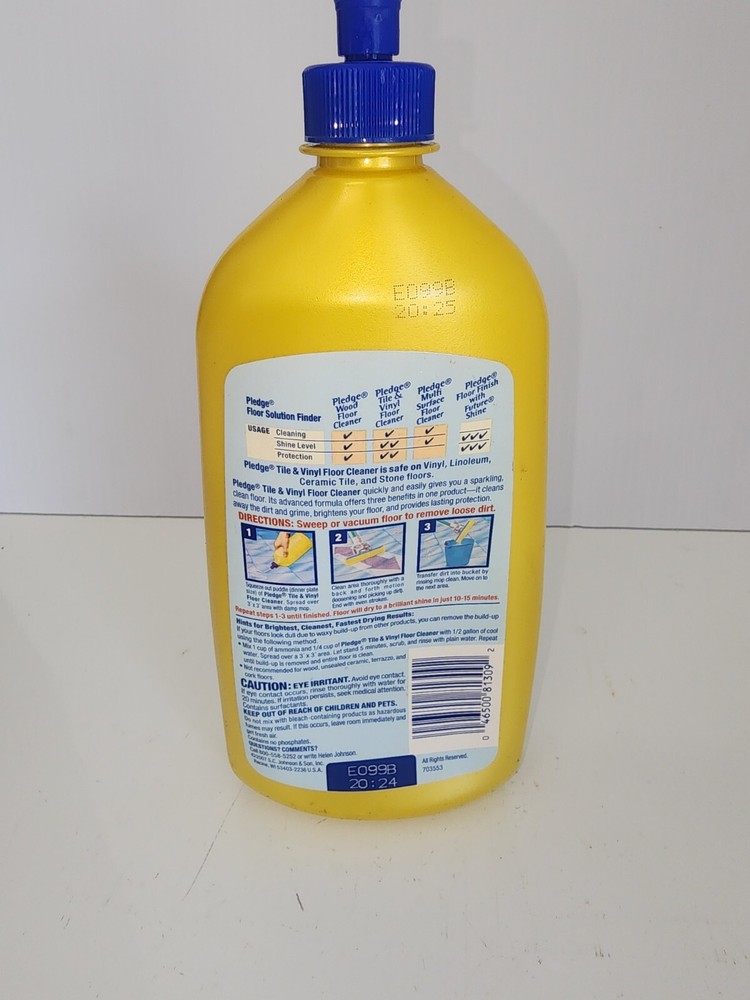 Keep your tile and vinyl floors looking clean and fresh with Pledge Floor Care Tile & Vinyl Floor 3-in-1 Squirt & Mop. This 27 oz bottle of cleaning solution is designed to make cleaning easy and efficient without the need for a bucket. The citrus scent leaves your floors smelling great while the no-fuss cleaning solution gets the job done quickly. This rare Bs109a Pledge product is perfect for those who want to maintain the beauty of their floors without the hassle of complicated cleaning procedures. With its unique formula, this cleaning solution is perfect for use on both tile and vinyl floors. Get your hands on this discontinued product today and experience the ease of cleaning your floors with Pledge Floor Care.