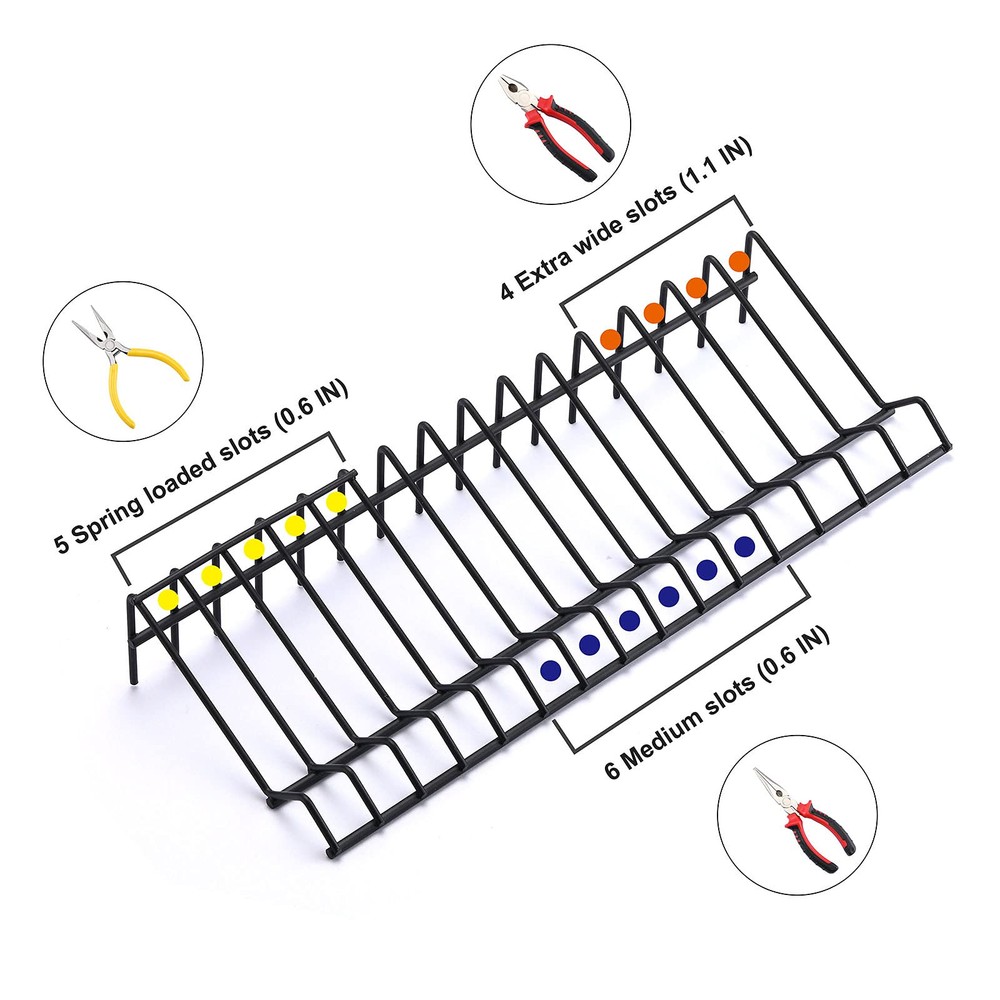 {Premium Quality}: - This plier rack organizer is made of high metal wire molding, protect the tools from damage, the steel framework of this wrench rack organizer is covered in a black anti-slip coating, so you can easily lift the entire rack of pliers from drawer and prevent pliers from slipping {Package Included}: - 2 Pack of pliers organizer rack, each size of the plier storage and organization holder is 15.11" x 5.75" x 2.36", there are 3 size slots of the rack, 5 slots for spring loaded pliers (0.6" wide), 6 medium slots for regular pliers (0.6" wide), 4 extra wide slots for wide handled pliers (1.1" wide), Note: All of the slots can be used for regular pliers. Keep your tools and accessories upright, customize your work space with the convenience of the toolbox organization {Saving Space & Time Spent Searching}: - Our tool box widget fit seamlessly in to your tool drawer and keeps your pliers organized and easy to find. Just a quick glance at the plier organizer and find the right-size plier immediately. No more messy toolbox, no more searching {Organize A Variety Of Tools}: - Wide enough to insulated plier set, needle nose pliers, long nose pliers, or long hose pliers, cutters, vise grips, strippers, scissors, utility knives, even to use these plier holders as a wrench organizer. Whether you want to keep pliers organized in a tool drawer, junk drawer, tool chest, or counter space, this screwdriver organizer rack will keep them right where you want them. The organizational possibilities are nearly endless {Perfect Gift}: - The pegboard wrench organizer is a perfect gift for any mechanic, hobbyist, or craftsmen who wants to organize all of their pliers in their toolbox for easy access and clean appearance