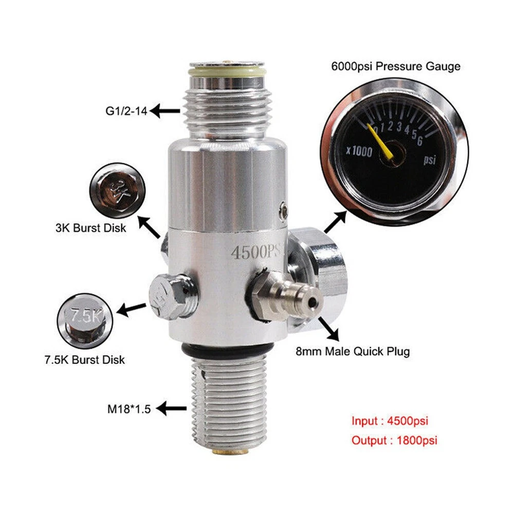 Plumbing Tank Regulator 4500psi Adapter Industrial Plumbing Pneumatics DESCRIPTION Features: brand new high quality PCP Accessories Gas Tank Regulator Input Pressure 4500PSI Output Pressure 850/1000-2000/2500-3000PSI Our for HP tank regulator comes standard with any 3000 psi high pressure air tank. The regulator is lightweight and easily rebuilt with high air fl ow. You can mount your tank with thread M 18*P1.5. Output thread size G1/2-14NGO. Product parameters: Material: copper alloy Input: 4500psi Output: 1800psi Input thread: M 18*P1.5. Output thread: G1/2-14NGO Applicable medium: oxygen; carbon dioxide Nominal diameter: 8mm Standard fl ow: 0.5L/s Package Included: 1 * Air Tank Regulator Note: 1.The real color of the item may be slightly different from the pictures shown on website caused by many factors such as brightness of your monitor and light brightness. 2.Please allow slight manual measurement deviation for the data. POLICES Shipping Payment WARRANTY We only ship to confirmed ebay Order addresses. Please comfirm that your Order address is in line with your shipping address. Please kindly note that the c ombined shipping is not provided because the shipping fee is calculated by weight. Also, the each additional item means exactly the the same color and size. It takes about 7 -15 working days to US; about 10-30 working days to other countries. Transit time may be a little delayed because of the bad weather and customs inspection . If you do not receive your item within 30 working days since payment finished, please contact us immediately for further assistance. Payment must be completed within 5 days. If you have any problems about payment, please contact us via ebay message. We strive for 100% customer satisfaction! Positive Feedback is very important to us. If you have any questions, p lease feel free to contact us via "Ask seller a question" . We will reply your email within 24 working hours.