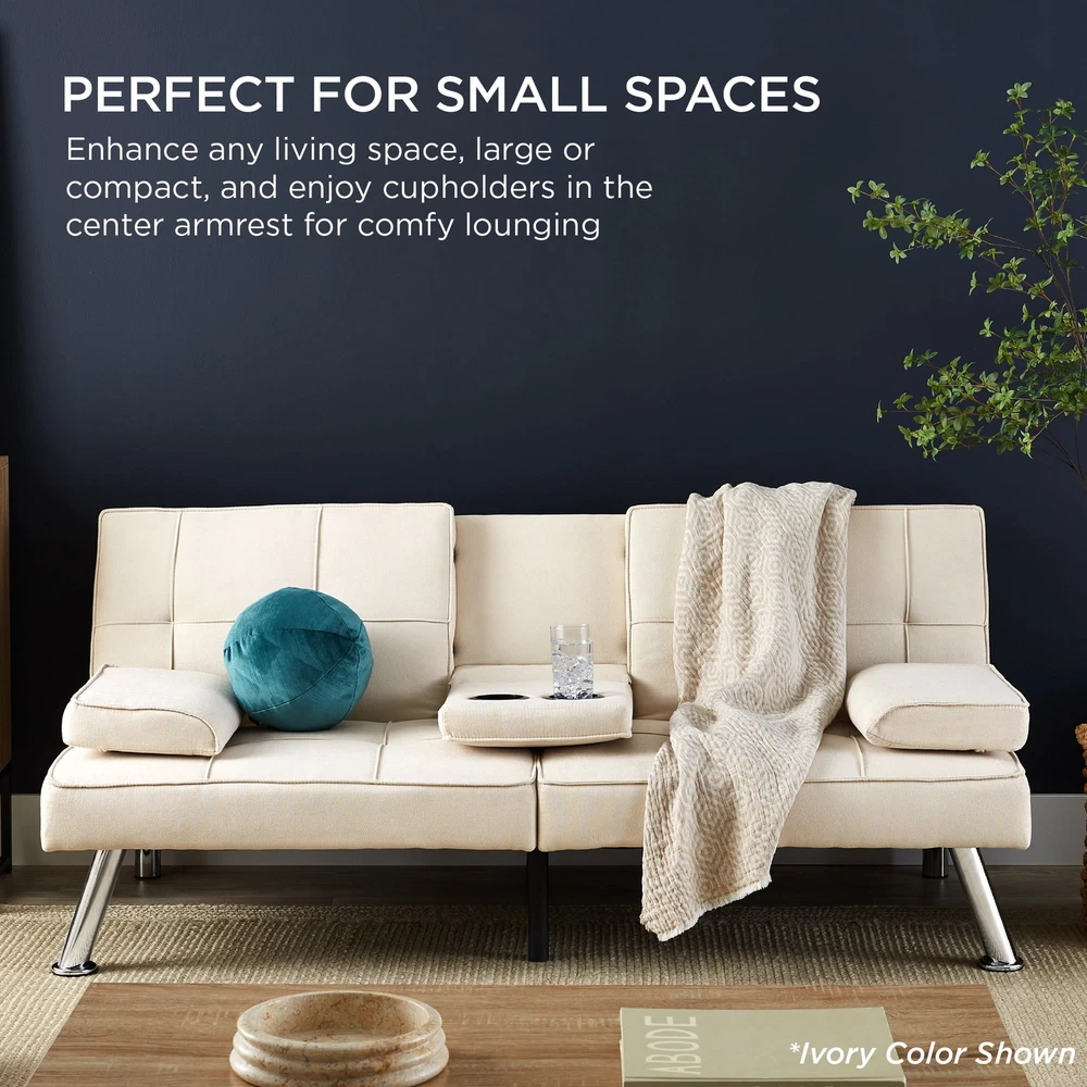 Enhance your living space with this versatile convertible futon sofa bed, designed to provide both comfort and functionality. Upholstered in soft linen fabric, it features a tufted backrest and sleek chrome metal legs, adding a modern touch to any room. The adjustable backrest offers three positions—upright for engaging conversations, reclined for relaxed lounging, and flat to accommodate overnight guests. A fold-down armrest equipped with convenient cup holders ensures your beverages are always within reach. With a sturdy construction supporting up to 500 pounds, this futon is perfect for small spaces like apartments or dorm rooms, seamlessly blending style and practicality.