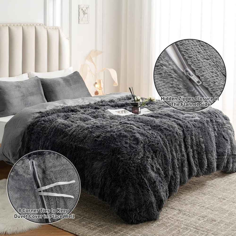 About this item WARM LIKE SPRING – Incredibly soft ! Our plush comforter set is fluffier and thicker than general one;the duvet cover is warm and cosy, adding a cosy, lazy spring vibe to your bedroom;You only complaint may be how hard thing makes it to get out of bed in the mornings! LUXURY SOFT MATERIAL - The bedding front is 380 GSM silky shaggy faux fur, while the reverse is 220 GSM flannel; This duvet cover is warm, comfortable,with long silk-like, luxurious fibers that seemingly engulf your skin in a cradle of comfort,give you a perfect sleep STYLISH - CHOSHOME luxury duvet cover is stylish, with a silent zip for easy removal and washing, 8 corner cords to prevent shifting and keep the duvet cover neat and orderly, and a hidden zip that enhances the overall elegance and beauty of the bedding MULTI-PURPOSE - Tuck the ultra soft comforter into the comforter cover for warmth in cold weather; it also makes a great cold-weather quilt in early spring and late fall;This comforter cover set is perfect for everyday use or as a gift for anyone WHAT YOU GET - This fluffy thick duvet cover set includes 1x duvet cover (104"x 90"), 2x Pillowcases (20" x 26"), Note: Quilts and sheets are not included; Before purchase,we recommend checking your bed's size 380GSM Faux Fur - Thick & Warm The front material is 380GSM faux fur, offering a soft and warm touch. It adds luxury to your bedding while being durable and easy to care for. 220GSM Flannel - Smooth & Soft The 220GSM Flannel backing provides a plush, soft touch for duvet covers, adding both comfort and durability with its smooth, cozy texture. Zipper Closure Zipper closure ensures a secure fit, preventing the comforter from shifting or slipping out and making it easy to remove or insert the duvet. 8 Corner Ties 8 corner ties inside the duvet cover keep the comforter securely in place, preventing it from shifting and ensuring a smooth, even appearance.