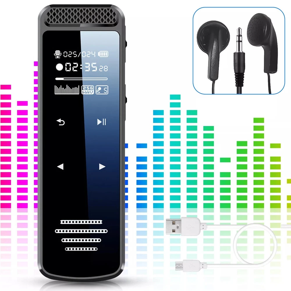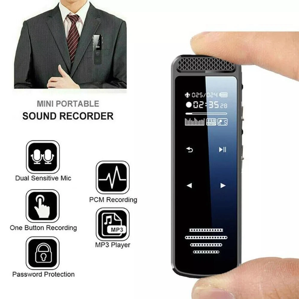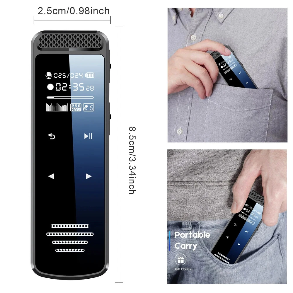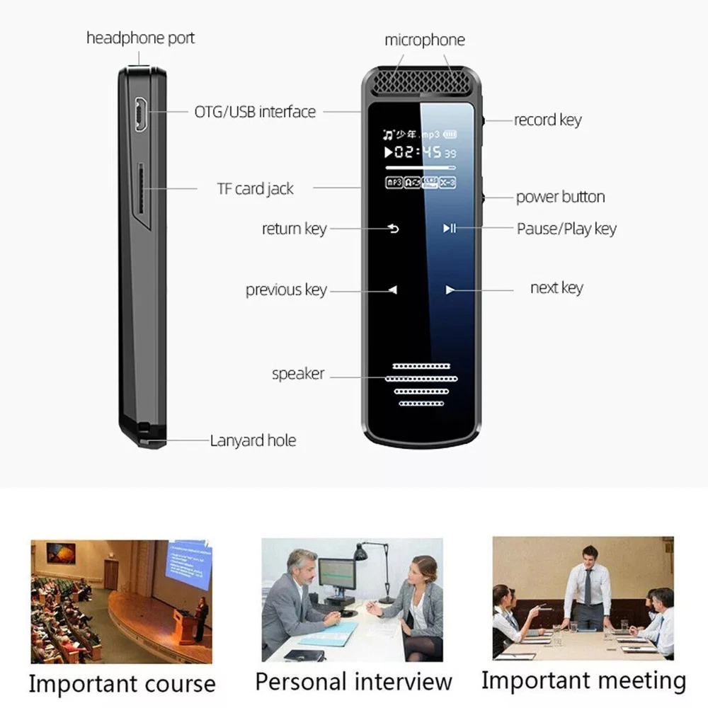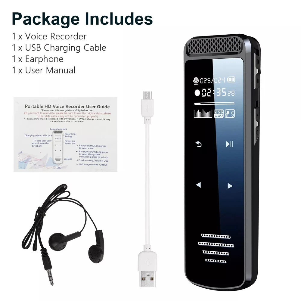 Product Feature: Upgraded Recording Quality: New design digital voice recorder, can realize HD remote recording, and the sound is very clear within 10 meters. 8-core DSP Noise Reduction: This recorder uses the original professional chip. Its fidelity can be as high as 99.5%. The recording effect is as if you hear it yourself. Long Time to Use: This recorder has an extremely long recording time and can be recorded for up to 1200 minutes. This USB recording device built-in a rechargeable battery that lets you focus on your note-taking. Anti-Leak Protection: With a password boot function, the audio voice recorder can effectively protect its internal data to prevent disclosing secrets. Multi-mode: This recorder has a variety of modes for you to choose from. You can freely switch between loop mode, sound mode, and repeating mode. Five quality recordings are available for this recorder, 32KBPS-384KBPS. You can easily choose what you need. This recorder has an MP3 playback function. Besides recording voice, you can also listen to music. Portable and Easy to Use: This mini digital recorder has a sturdy metal body, feeling good when holding it in your palm, it will fit into your purse or pocket without adding extra bulk. Rich Features: It also can be applied in multiple scenarios and is a useful recorder for presentations, conferences, interviews, presentations, and classes if you wanted to. Perfect for those who are not good at machines, even beginners, old people, etc. Product Specification: Type:Digital Voice Recorder Color :Black Resolution LCM 96*64 Distortion rate <0.008% Product Weight 56g Signal To Noise Ratio >90db Recording Format WAV/MP3 Charging Time Around 2 hours TF Card Up to 256GB (not included) Frequency Response 20Hz-20KHz Product Size 86*28*11.5(mm) Play Format MP3/WMA/WAV/OGG/APE/FLAC/AAC Sampling Rate 48KHz Battery Environmentally friendly polymer lithium battery Package Included: 1 x Voice Recorder 1 x USB Charging Cable 1 x Earphone 1 x User Manual