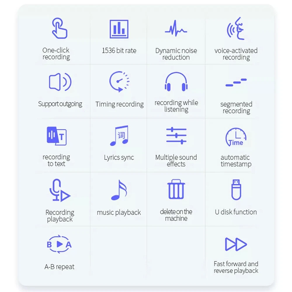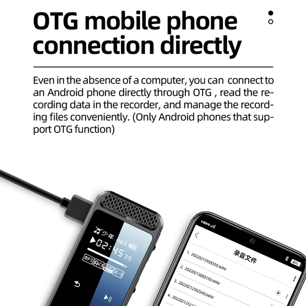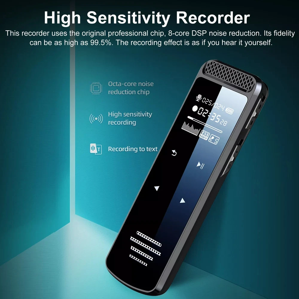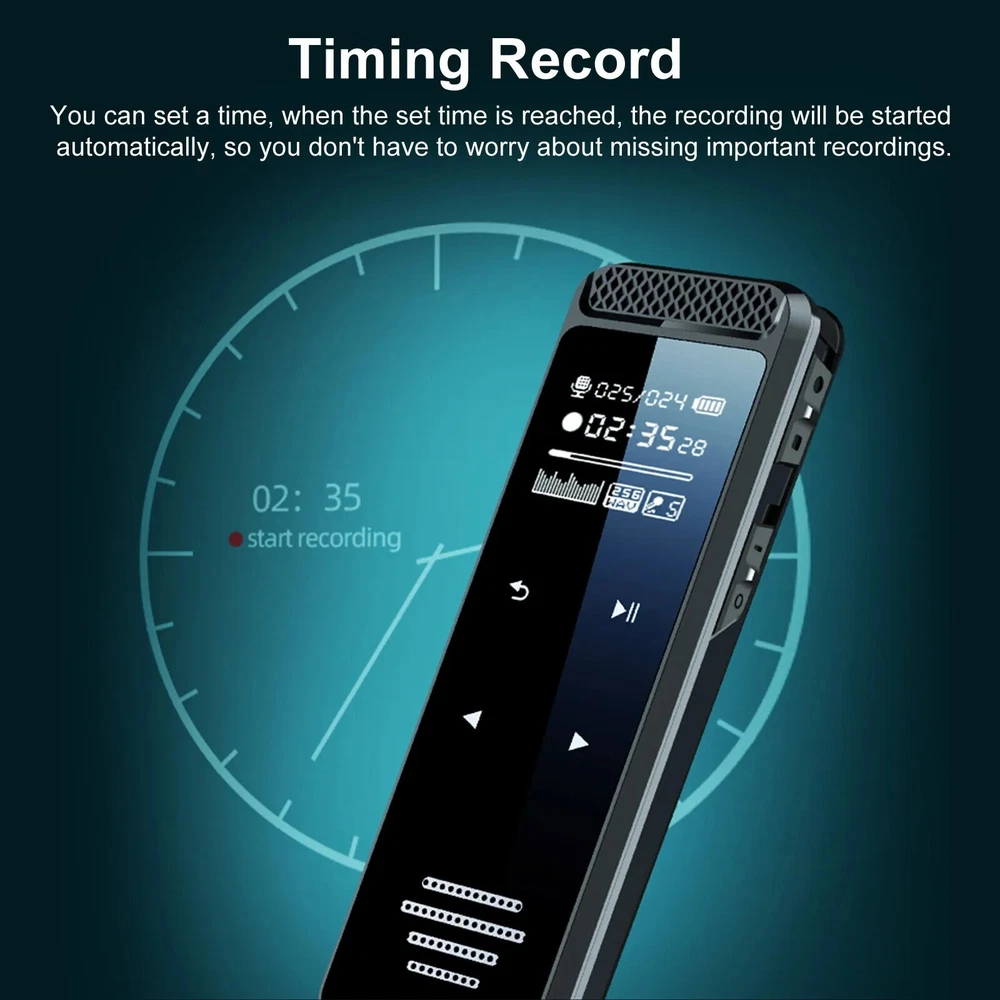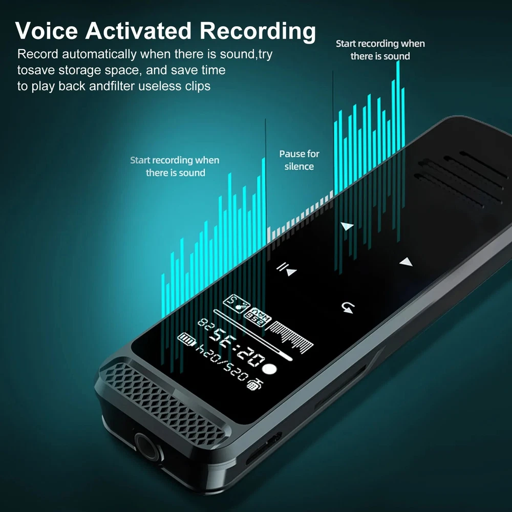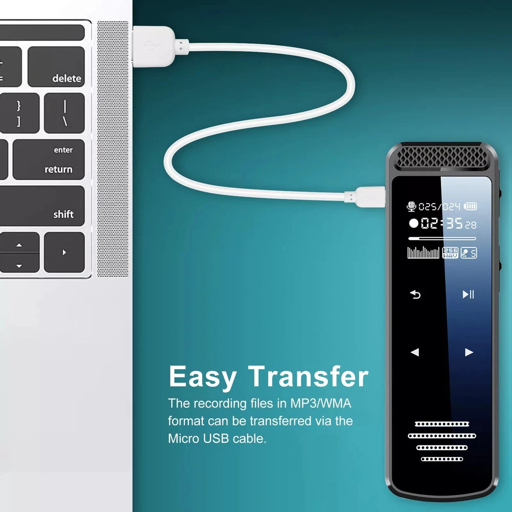 Product Feature: Upgraded Recording Quality: New design digital voice recorder, can realize HD remote recording, and the sound is very clear within 10 meters. 8-core DSP Noise Reduction: This recorder uses the original professional chip. Its fidelity can be as high as 99.5%. The recording effect is as if you hear it yourself. Long Time to Use: This recorder has an extremely long recording time and can be recorded for up to 1200 minutes. This USB recording device built-in a rechargeable battery that lets you focus on your note-taking. Anti-Leak Protection: With a password boot function, the audio voice recorder can effectively protect its internal data to prevent disclosing secrets. Multi-mode: This recorder has a variety of modes for you to choose from. You can freely switch between loop mode, sound mode, and repeating mode. Five quality recordings are available for this recorder, 32KBPS-384KBPS. You can easily choose what you need. This recorder has an MP3 playback function. Besides recording voice, you can also listen to music. Portable and Easy to Use: This mini digital recorder has a sturdy metal body, feeling good when holding it in your palm, it will fit into your purse or pocket without adding extra bulk. Rich Features: It also can be applied in multiple scenarios and is a useful recorder for presentations, conferences, interviews, presentations, and classes if you wanted to. Perfect for those who are not good at machines, even beginners, old people, etc. Product Specification: Type:Digital Voice Recorder Color :Black Resolution LCM 96*64 Distortion rate <0.008% Product Weight 56g Signal To Noise Ratio >90db Recording Format WAV/MP3 Charging Time Around 2 hours TF Card Up to 256GB (not included) Frequency Response 20Hz-20KHz Product Size 86*28*11.5(mm) Play Format MP3/WMA/WAV/OGG/APE/FLAC/AAC Sampling Rate 48KHz Battery Environmentally friendly polymer lithium battery Package Included: 1 x Voice Recorder 1 x USB Charging Cable 1 x Earphone 1 x User Manual