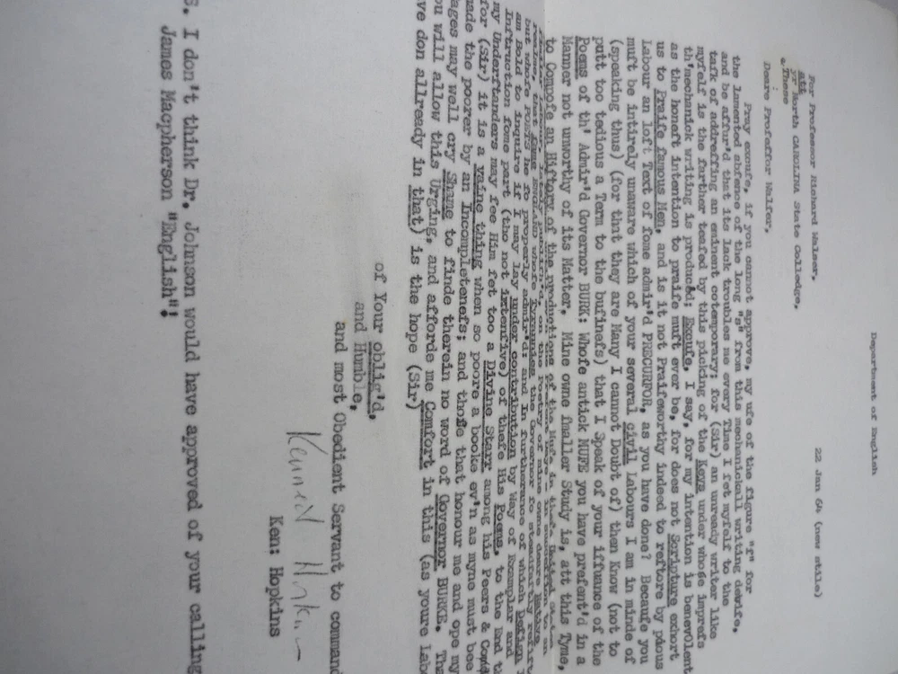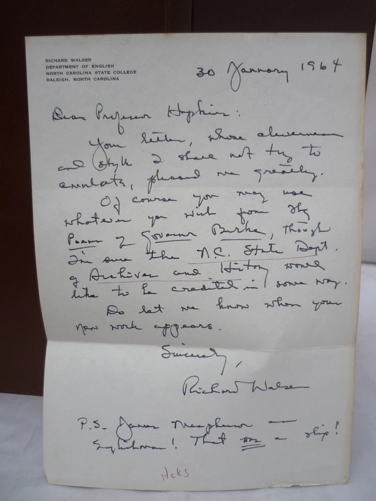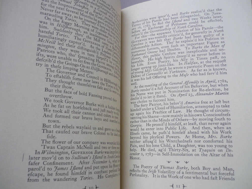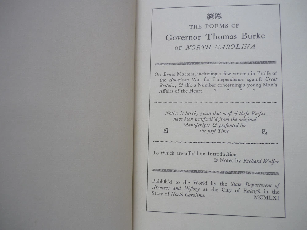 Contact Us Visit Our Store Home About Us Shipping Returns Contact Us View Feedback The Poems of Governor Thomas Burke of North Carolina On Divers Matters including a few Written in Praise of the American War for Independence Against Great Britain Hardback published in 1961 by State Dept of Archives and History at the City of Raleigh. Introduction and notes by Richard Walser, letter enclosed to Professor Kenneth Hopkins from Richard Walser. 69 pages with tanning, boards a little marked. Home About Us Shipping Returns Contact Us View Feedback