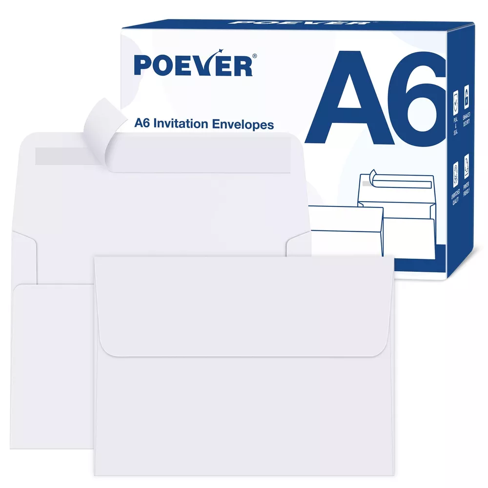 Set of 120 Pack A6 Invitation Envelopes: Poever A6 invitation envelopes set includes 120 pack white envelopes and a sturdy box for shipping protection and easy storage. Each A6 invitation envelope measures 6.5 x 4.75 inches, perfect size for greeting cards, holiday cards, photos, postcards, invitations, letters, announcements, thank you notes, RSVP and more Envelopes Protect Your Privacy: Our A6 small envelopes are made of premium 120 GSM paper stock, which are thick enough to prevent transparency and ensure the items inside are not see-through. Poever White Invitation Envelopes are well-made and durable, prevent your contents from scratch and stain Self-Seal Envelopes For Easy Use and Security: Each A6 white greeting cards envelope comes with a strong adhesive strip for quick self peel and seal, no glue, wax or tape needed. The adhesive strip is strong and lasting, which could create a full and long-time secure seal, protects your documents from damage or falling out of A6 envelopes Printable Blank Envelopes: Poever A6 blank envelopes are compatible with most Inkjet and laser printers, no worry about smudging or jamming. Customize your own envelopes by stamps, stickers, drawing, or printing patterns on them. Ideal for holidays invitation like Christmas, Valentine's Day, Mother's Day etc, and also for party and event invitations like wedding, baby showers, birthday etc. Also perfect for office and business use