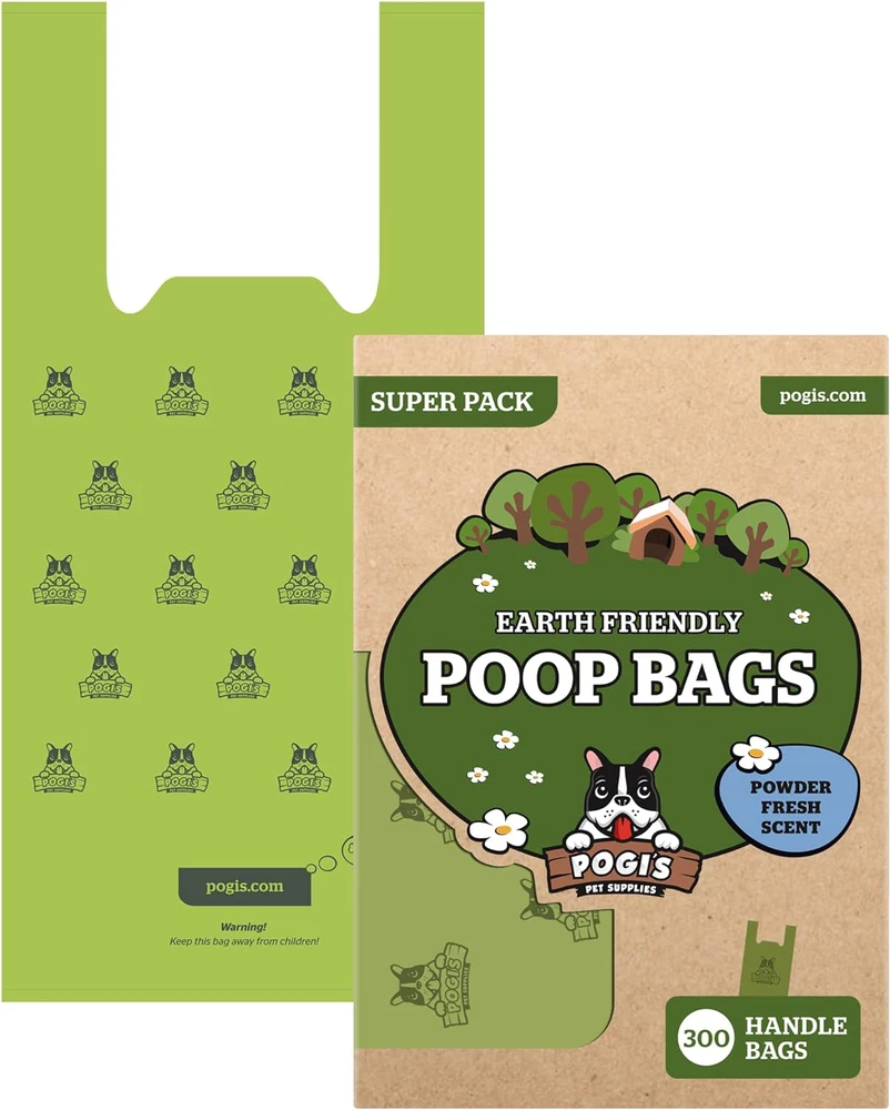 Large Dog Poop Bags with Handles (7 x 14.5 inches) - Made big enough for even the largest of dogs, and thick enough to ensure there are no messes. Easy Breezy - Our doggy poop bags smoothly dispense from the box and feature tie handles so you can enjoy a stress-free walk with your furry family members. Fresh Powder Scented Dog Bags - The fresh scent confidently locks in nose-shattering odors. Cat Litter Scoop Bags - Pogi's Cat Poop Bags also work great as litter bags for cat poop. Super Pack - 300 Heavy Duty Dog Poop Bags with Easy-Tie Handles (not on rolls) - 4+ Month Supply