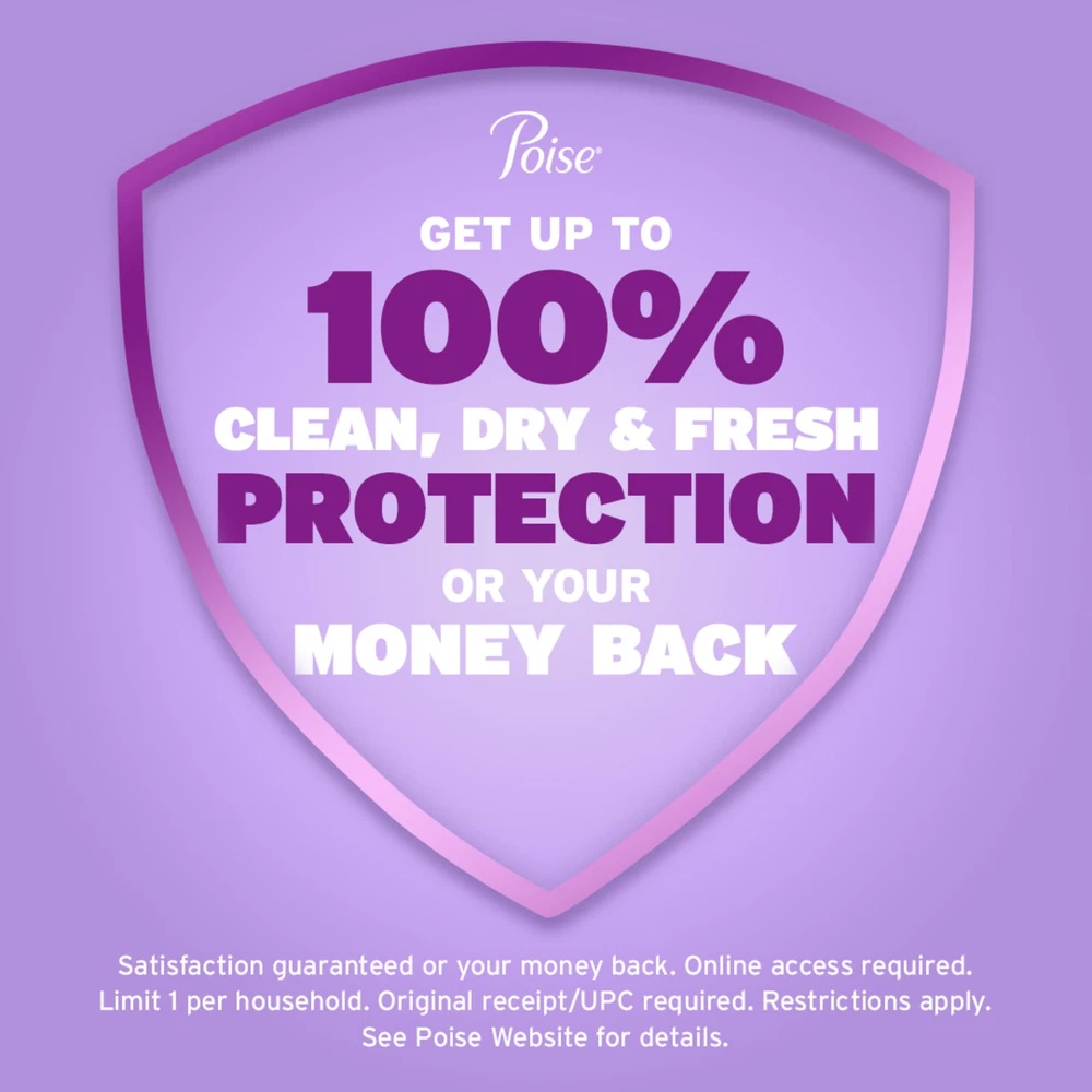 Enjoy up to 100% clean, dry and fresh protection guaranteed* with Poise Incontinence & Postpartum Pads for Bladder Leaks. Unlike period pads, which are meant for menstrual needs, Poise pads are designed to offer protection against light bladder leaks. These disposable incontinence pads instantly absorb for up to zero odor and rapidly lock away more wetness** for amazing dryness. In fact, Poise incontinence pads for women are made with odor-reducing material and helps control odor for up to 12 hours. They also come with a moisture-wicking top layer that is designed to feel dry throughout wear. Plus, our pads for women are 25x drier than the leading period pad, offer up to zero leaks, and deliver up to 12 hours of protection. INSTANT ABSORBTION: Poise pads for women instantly absorb and rapidly lock away more wetness than the leading period pad for amazing dryness UP TO ZERO ODOR: Each incontinence pad is made with odor-reducing material and helps control odor for up to 12 hours WETNESS PROTECTION: These women’s incontinence pads are made with a moisture-wicking top layer designed to feel dry throughout wear UP TO ZERO LEAKS: Poise Incontinence Pads for Women are 25x drier than the leading period pad and offer up to 12 hours of bladder leak protection