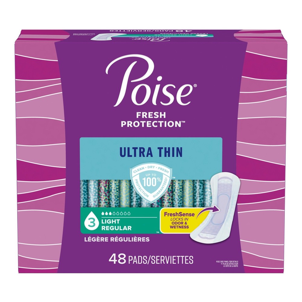 Feel confident with our thinnest incontinence pads, Poise Ultra Thin Incontinence Pads. Designed to protect against minor bladder leaks, Poise pads are different from sanitary napkins designed for menstrual needs. Each bladder control pad features a dry-touch layer that quickly locks out 10 times more* of moisture for a dry feel and zero leaks. Plus, our disposable incontinence pads are leak-proof for dry comfort and superior protection. As our thinnest protection, our incontinence pads feature a Thin-Flex design that maintains their shape for all-day comfort. Made with breathable material, these incontinence pads for women allow fresh air to enter, helping to eliminate moisture and leaving you feeling clean and refreshed. Poise incontinence pads are available in light, medium, and strong absorbency. If you need light absorbency, check out Poise Everyday Pads. POISE Ultra-Thin Incontinence Pads: 48 Incontinence & Postpartum Leak-Proof Pads, 3 Drop Light Absorbency, Regular Length (48 Total) Our Thinnest Protection: Poise Ultra-Thin Pads feature a Thin-Flex design that maintains shape for all-day comfort. Designed to Stay Dry: Our Ultra-Thin Incontinence Pads feature a Dry-Touch layer that quickly locks in 10x* more moisture for a dry feel (*vs. leading pads, 24ml of liquid) Up to Zero Leakage: These Poise pads deliver up to zero leakage and feature leak-proof sides for superior dryness and protection. Odor Control Technology: Each incontinence pad features the Poise FreshSense system to help neutralize even the strongest leak odors for up to 12 hours. For all-night protection, try Poise 8 Drop Women's Nighttime Incontinence Pads Poise adult incontinence products are US HSA/FSA certified; products and packaging may vary